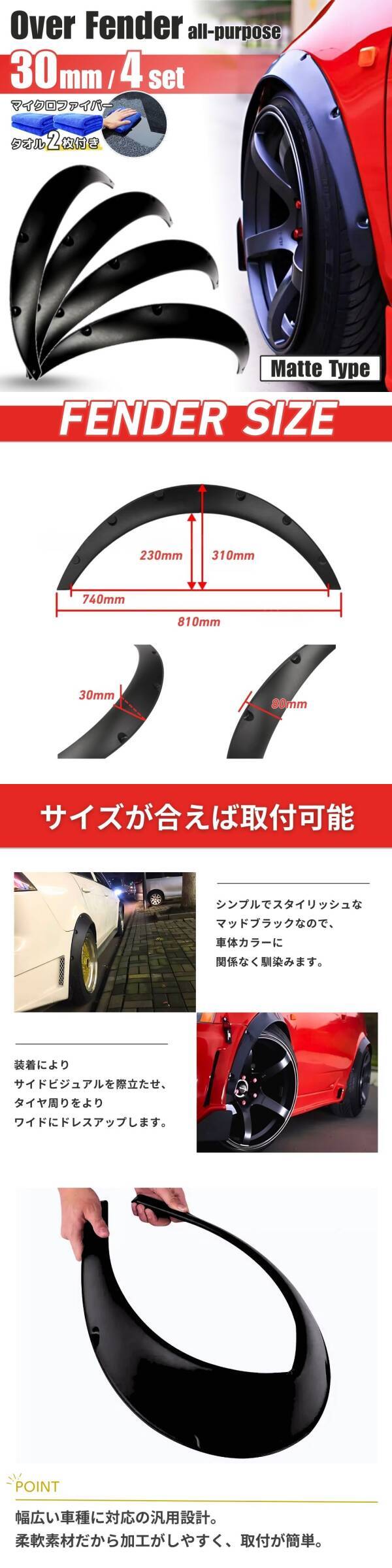 オーバーフェンダー 汎用 モール 出幅 30mm バーフェン マットブラック 4枚セット ハミタイ ジムニー セダン 黒 旧車 艶 つや 消し 軽トラ 收藏