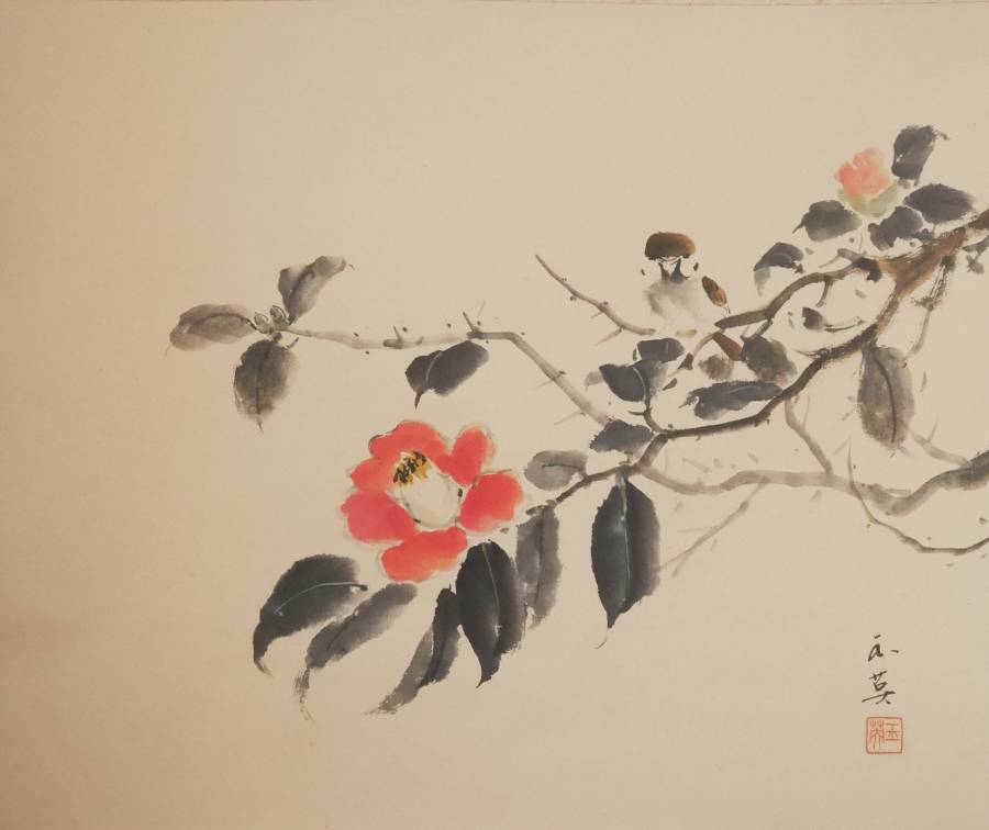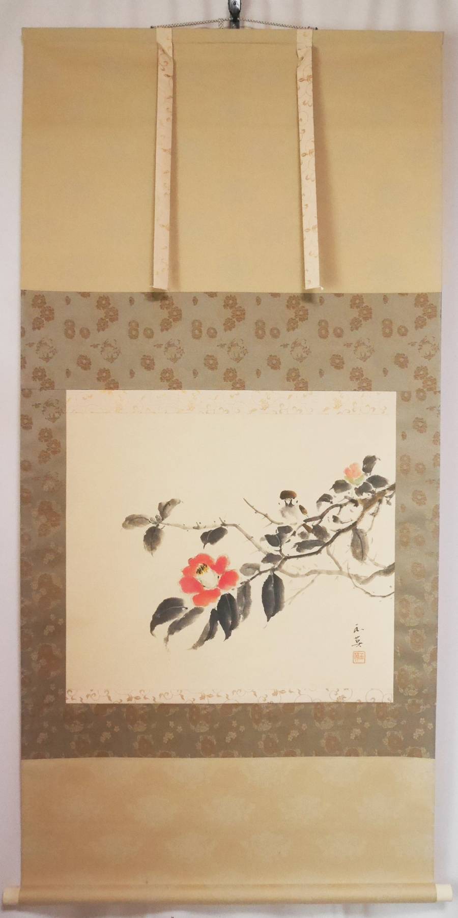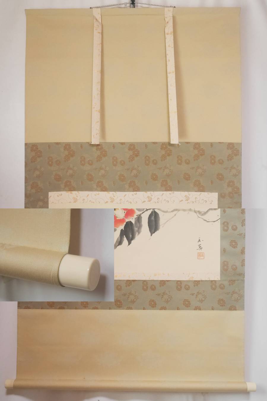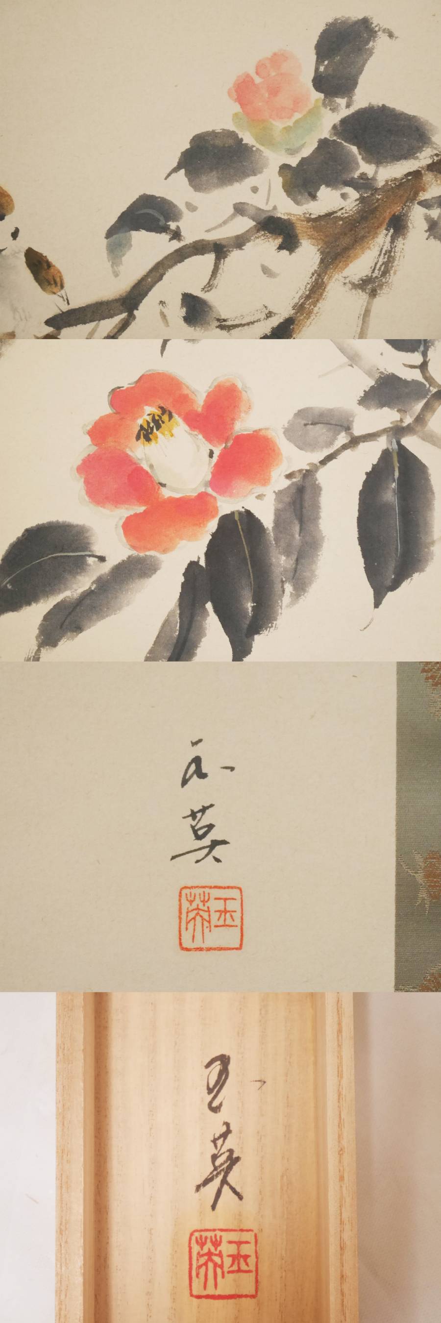 【真作】★茶掛け【椿 つばき】日本画家 宮台玉英(師: 山田玉雲)◆紙本 肉筆 共箱付 日本画 花鳥 掛軸 收藏