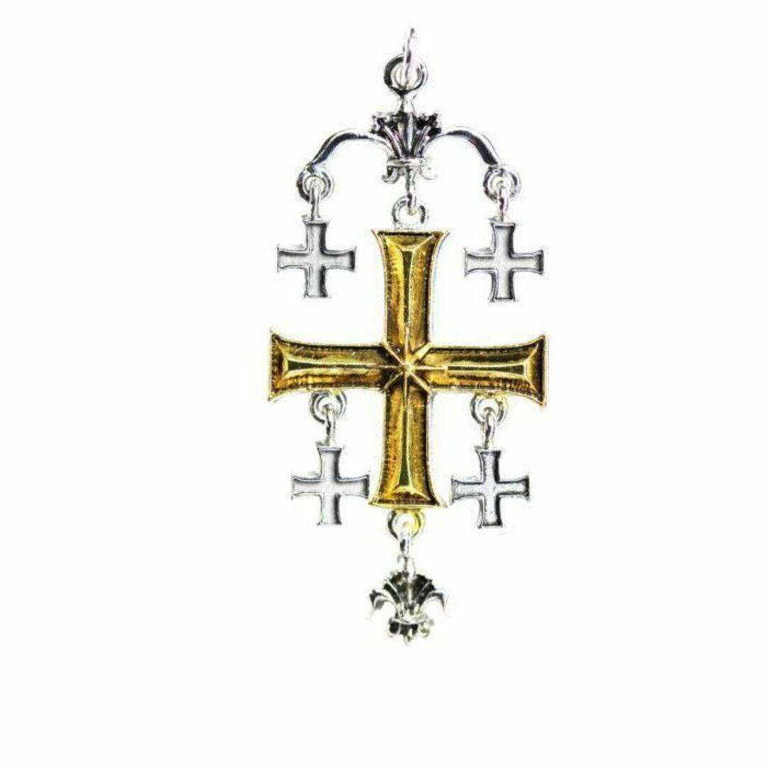 このペンダントは、中央の大きな十字架と、その四隅にある小さな十字架で構成される**「エルサレム十字(Jerusalem Cross)」をモチーフにしています。また、デザインの持つ歴史的背景から、「テンプル騎士団(Knights Templar)」**と関連付けて考えられることが多いシンボルです。