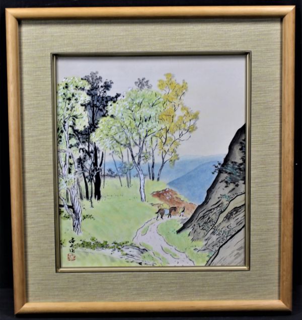 《真作》★湯上 呂久【峠路】日本画.色紙.額入*師 矢沢 弦月*煌彩社所属*川端学校*帝展*文展入選*物故*紅葉.馬.人物*旅路* [桃] 收藏