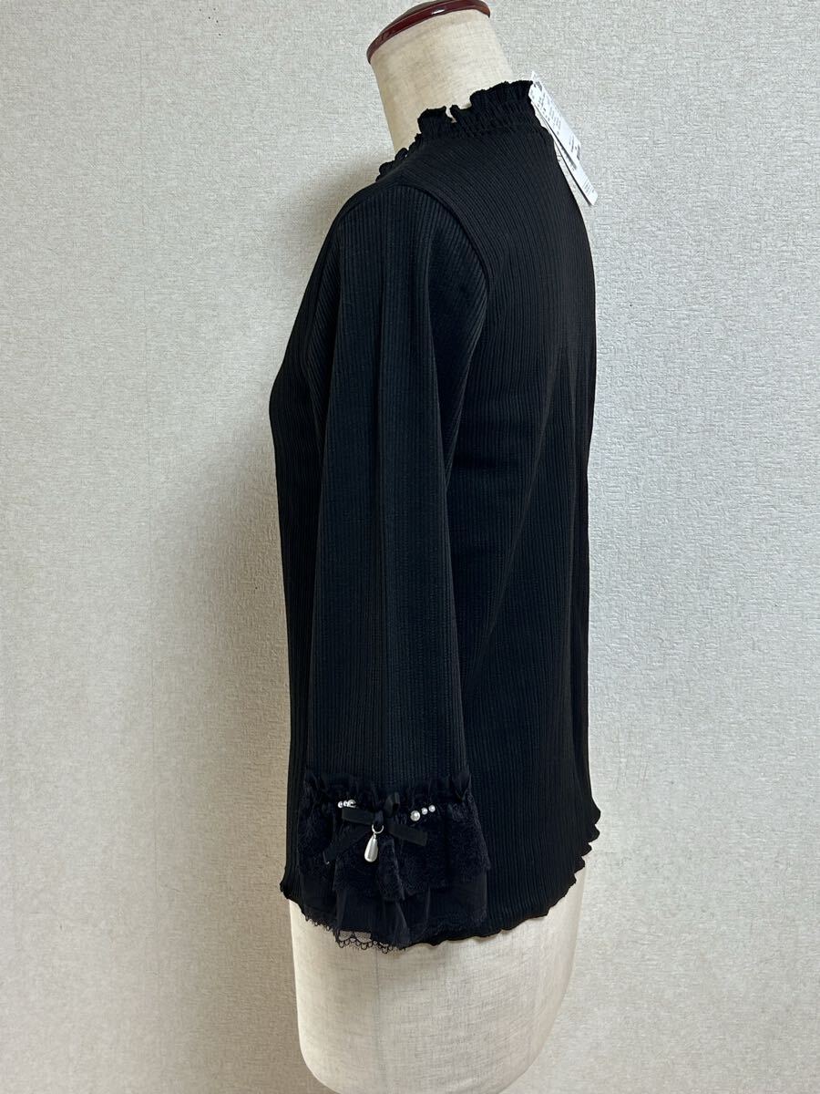 タグ付き【axes femme ★アクシーズファム】袖口レース重ねデザイン・リブカットソー・ブラック・Fサイズ