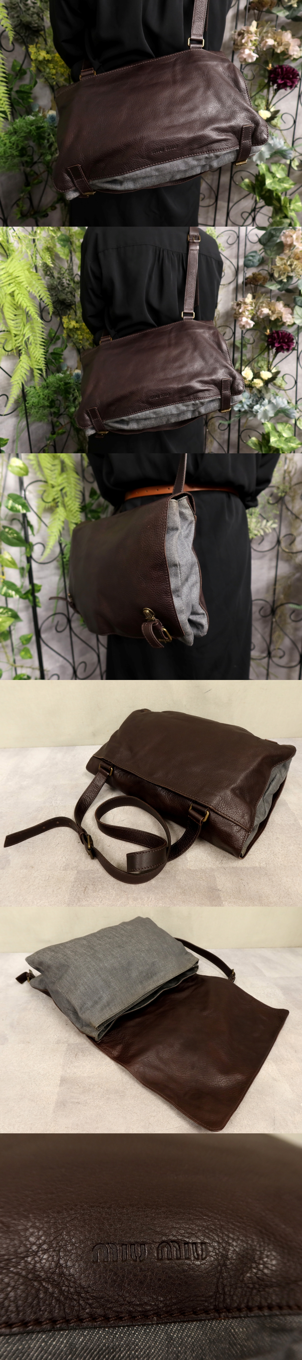 ●超美品●miu miu ミュウミュウ●メンズ●アーカイブ●ロゴ型押し●デニム カーフ レザー●ショルダー バッグ●ブラウン 黒●A4●Js61495 收藏