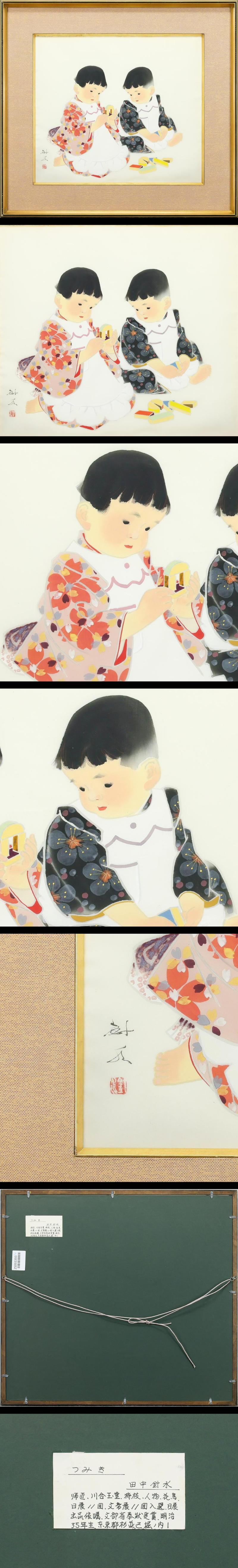 【真作】【WISH】田中針水「つみき」日本画 約10号 絹本 ◆童心あふれる微笑ましい情景 〇童子像重鎮 師:川合玉堂 #25093393 收藏