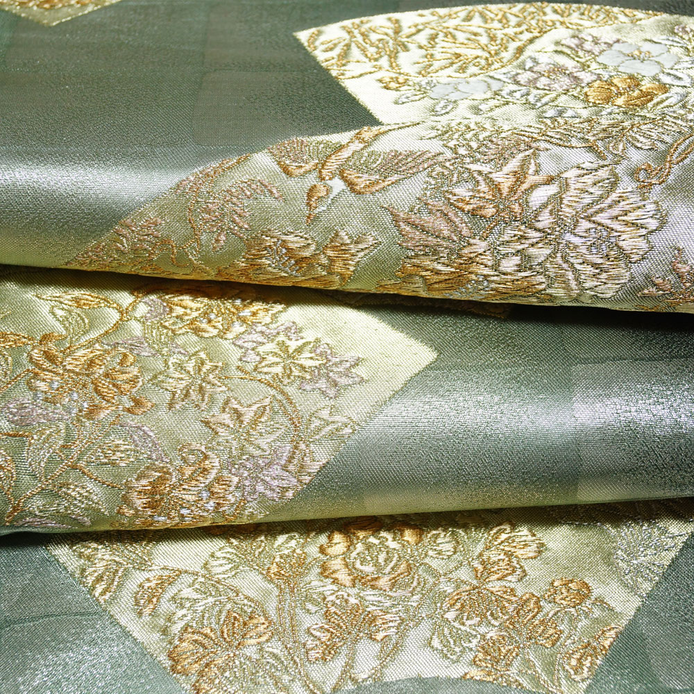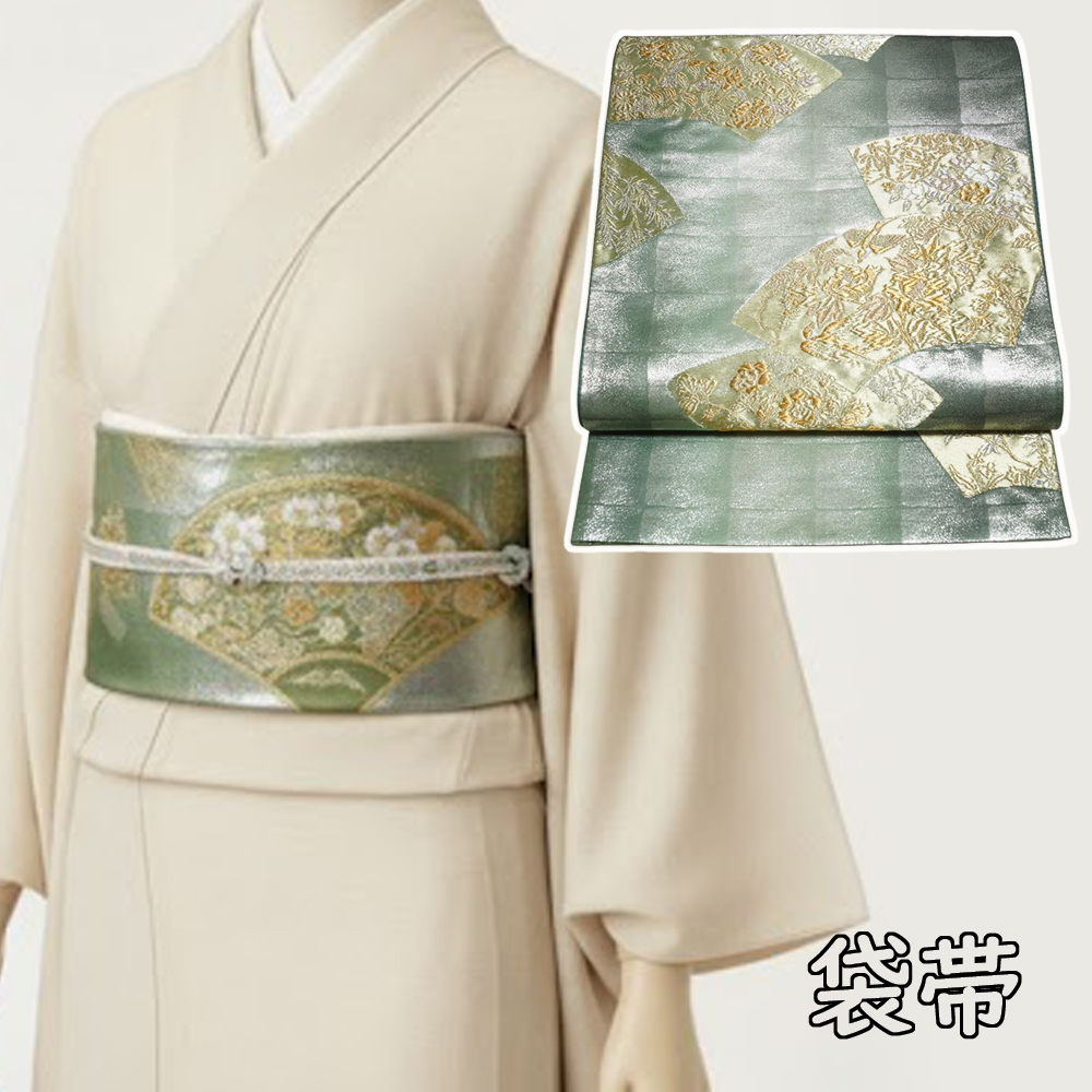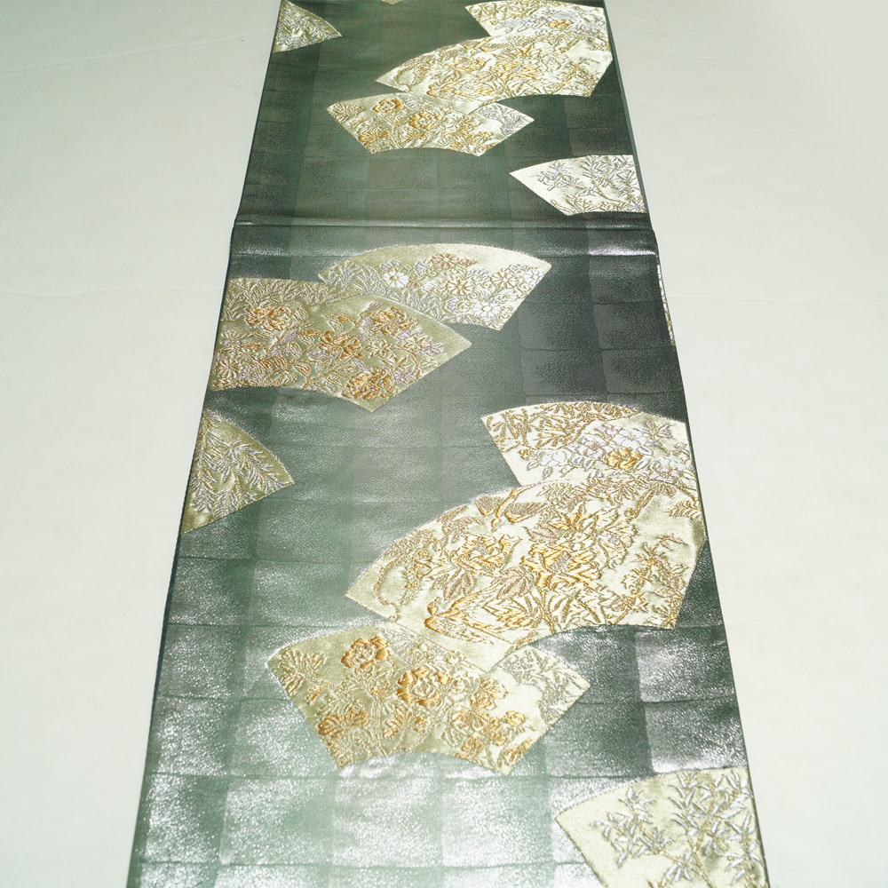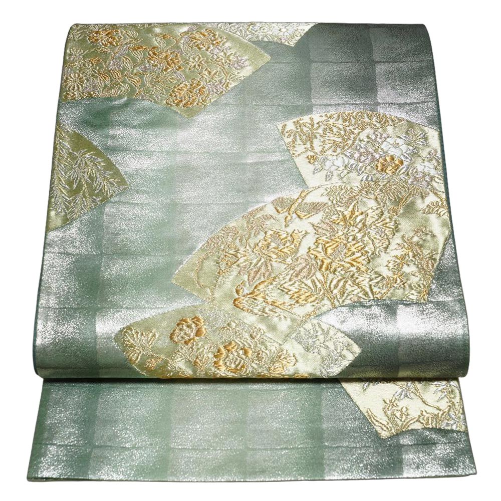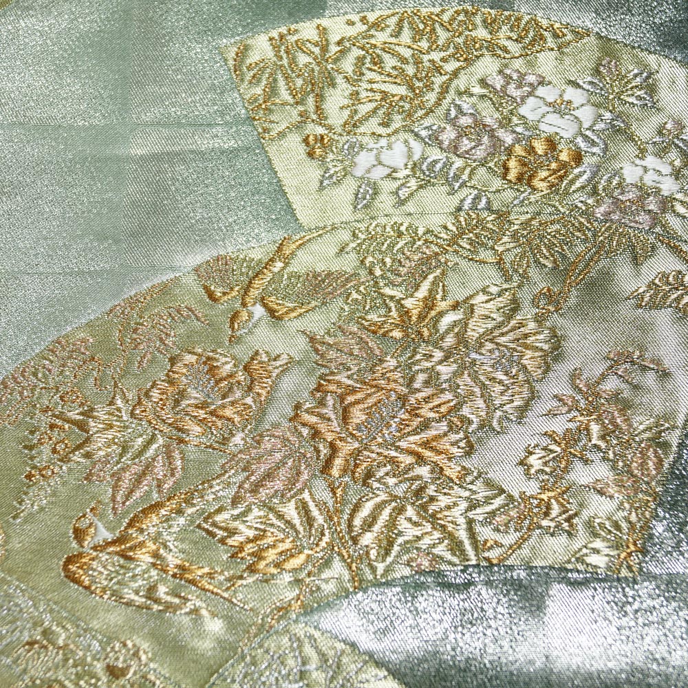 | 商品 説明 | 渋めの銀・木賊色系の格子模様の地に地紙に花鳥などの模様が織られた袋帯です。 |
