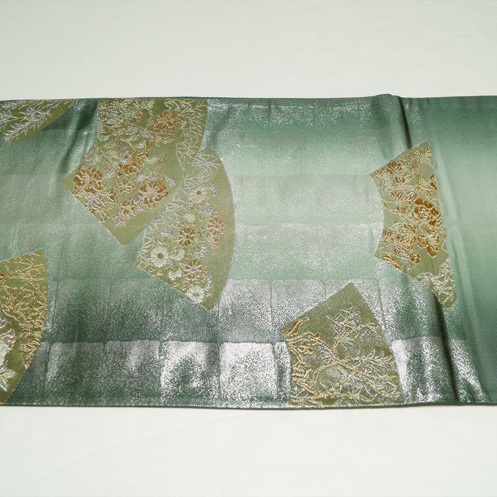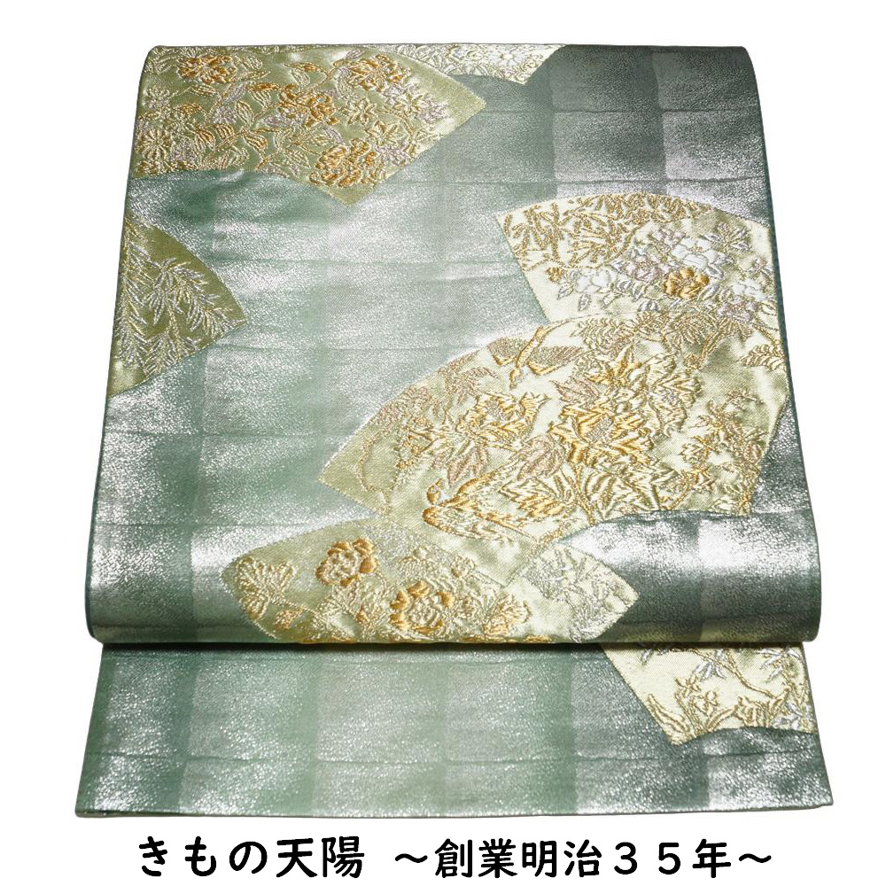 袋帯 格子に地紙・花鳥模様 金糸 ラメ糸 六通柄 銀・木賊色系 銀系 中古 リサイクル着物 帯 フォーマル 着物 きもの天陽 收藏