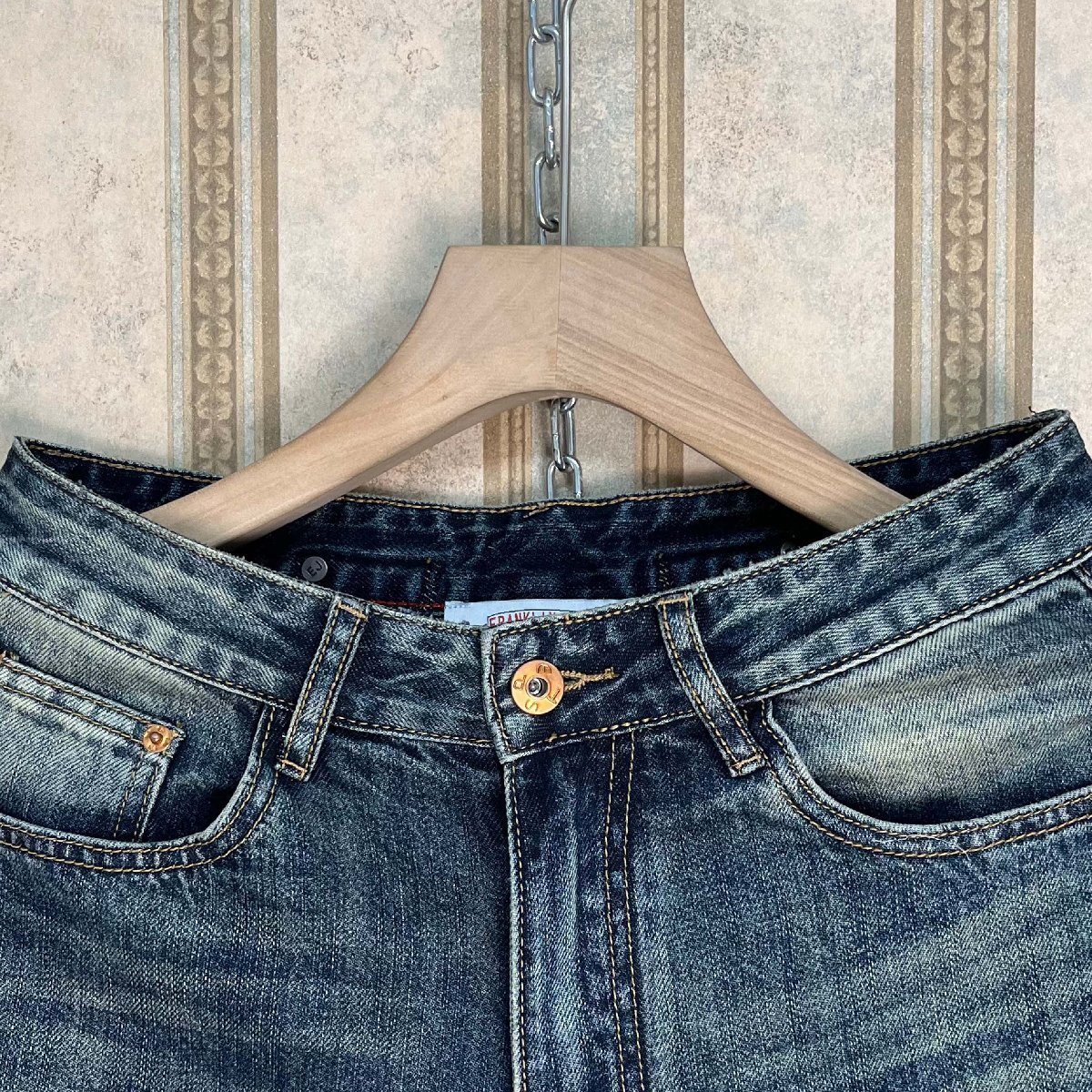 パッチワークで個性的な雰囲気を演出し、ダメージ加工でヴィンテージ風の味わいを表現。色落ち加工を施すことで、経年変化を楽しめる仕様に。さらに、前後のポケットは実用的で、小物を収納しやすく、シルエットも引き締めて見せます。