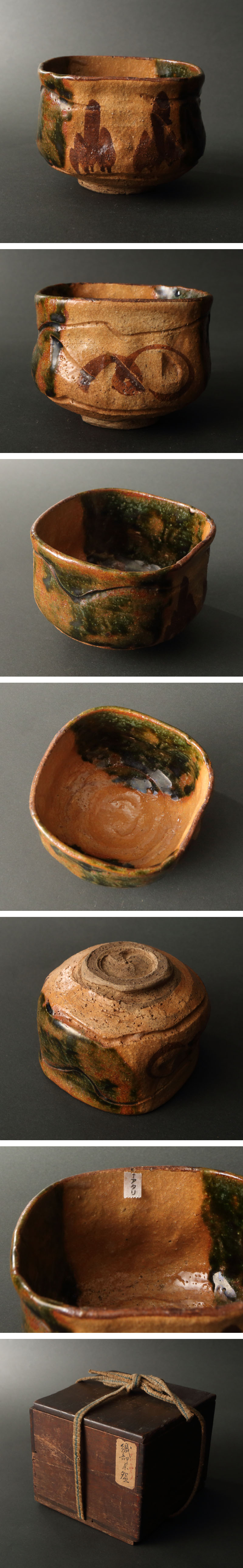 委託HK◇時代 織部四方茶碗(茶道具 陶磁器 陶芸 美濃焼 織部焼 青織部 飴色 抹茶碗 茶事 茶席 茶の湯 古物 骨董 茶の湯 時代物 ) 收藏