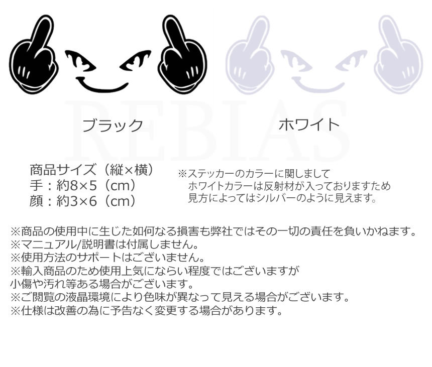 こちらのカラーは 【ホワイト】 になります。 マイカーを簡単にステッカーチューンでドレスアップ!定番から個性的なステッカー・エンブレムまでサッと貼るだけ、飽きたら剥がせばいいんです!リアに貼ってさり気なく個性をアピールするもよし、フロントやサイドでド派手に決めるもよし!アイデア次第で無限に広がるステッカーチューンを是非お試しください♪♪商品サイズ(縦×横)手:約8×5(cm)顔:約3×6(cm)※ステッカーのカラーに関しまして、 ホワイトカラーは反射材が入っておりますため、 見方によってはシルバーのように見えます。| 出价者 | 信用 | 价格 | 时间 |