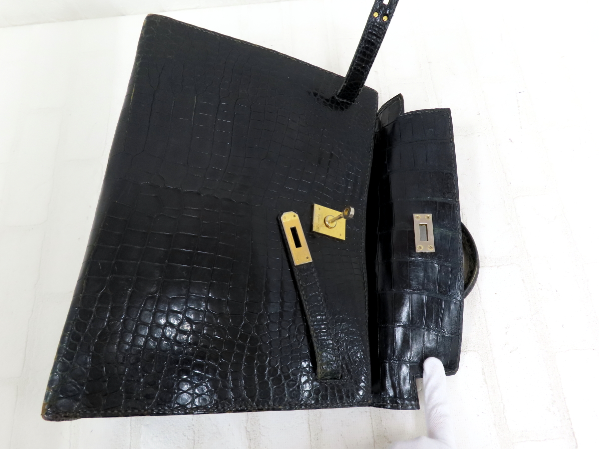 ◆DeVerre デベール◆クロコダイル 本 ワニ 革◆ハンド バッグ◆ブラック ゴールド金具◆ヴィンテージ◆フラップ◆トップハンドル◆A14443 收藏