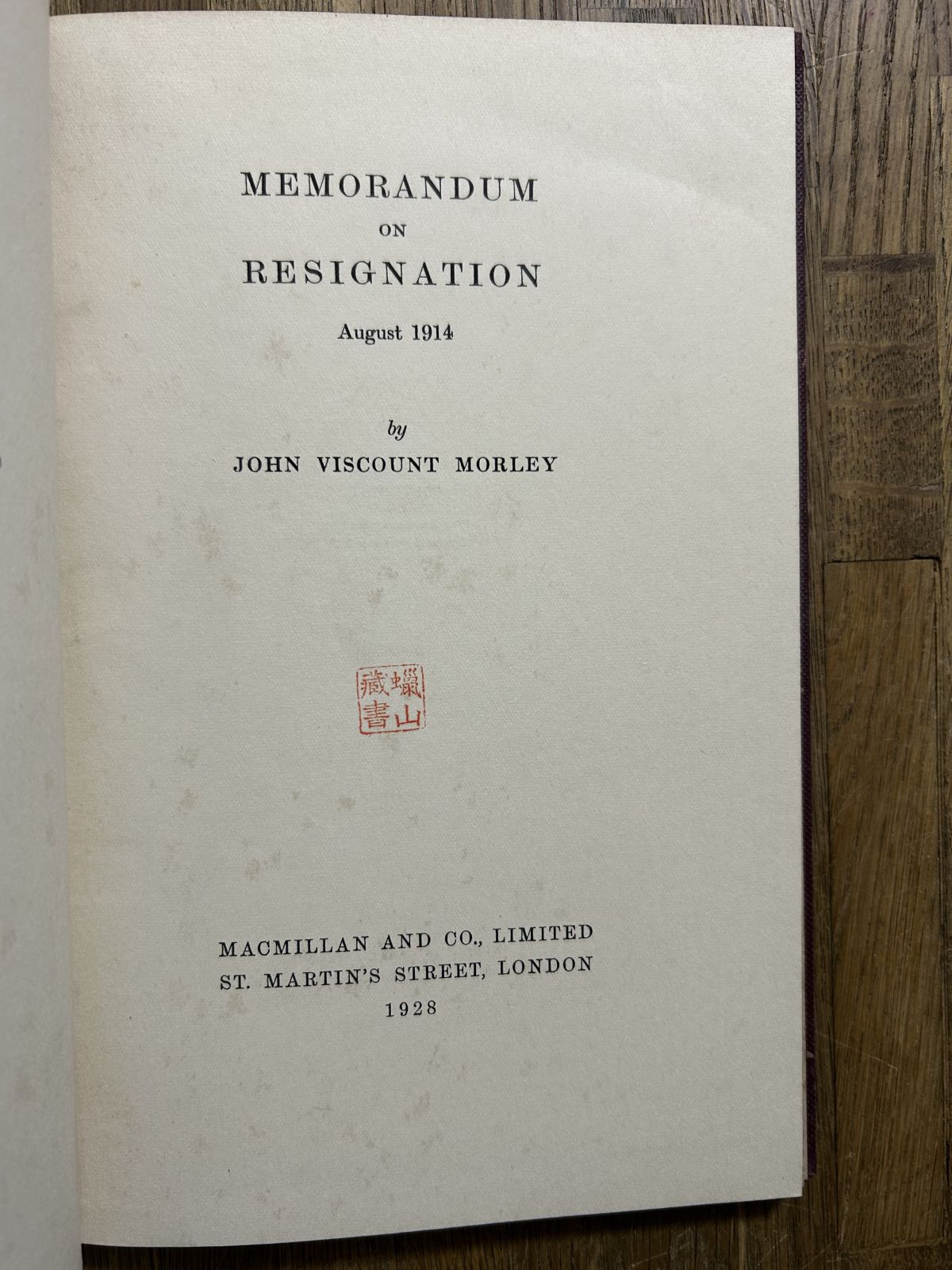 1928年初版 モーリー John Viscount Morley, Memorandum on Resignation: August 1914 英文洋書古書 收藏