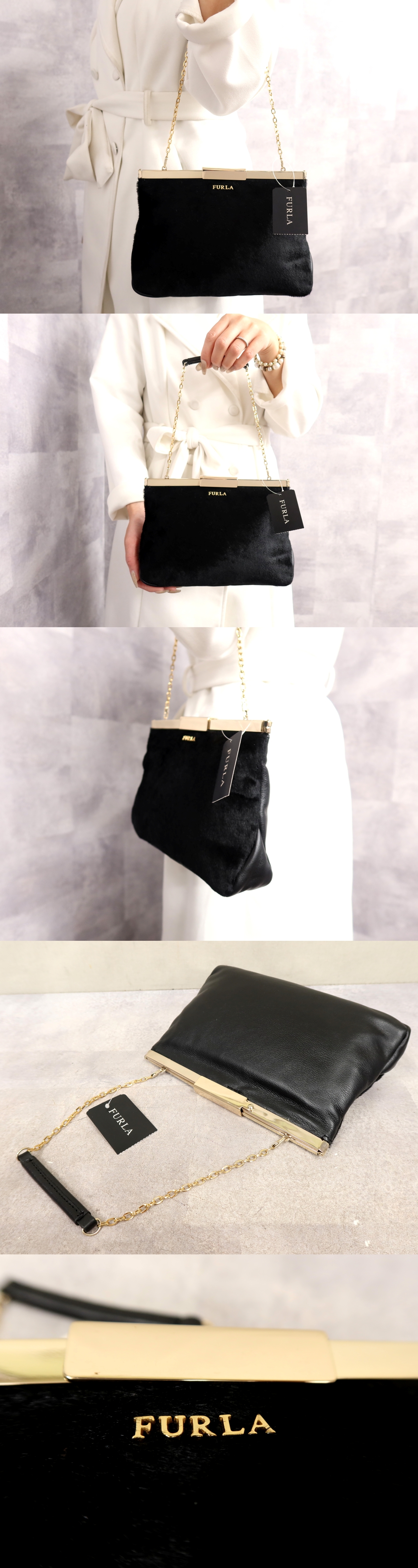 ●超美品●FURLA フルラ●ロゴ金具●ハラコ カーフ レザー 本革●チェーン ハンド バッグ●黒●ゴールド金具●腕掛け●かばん●Js63404 收藏
