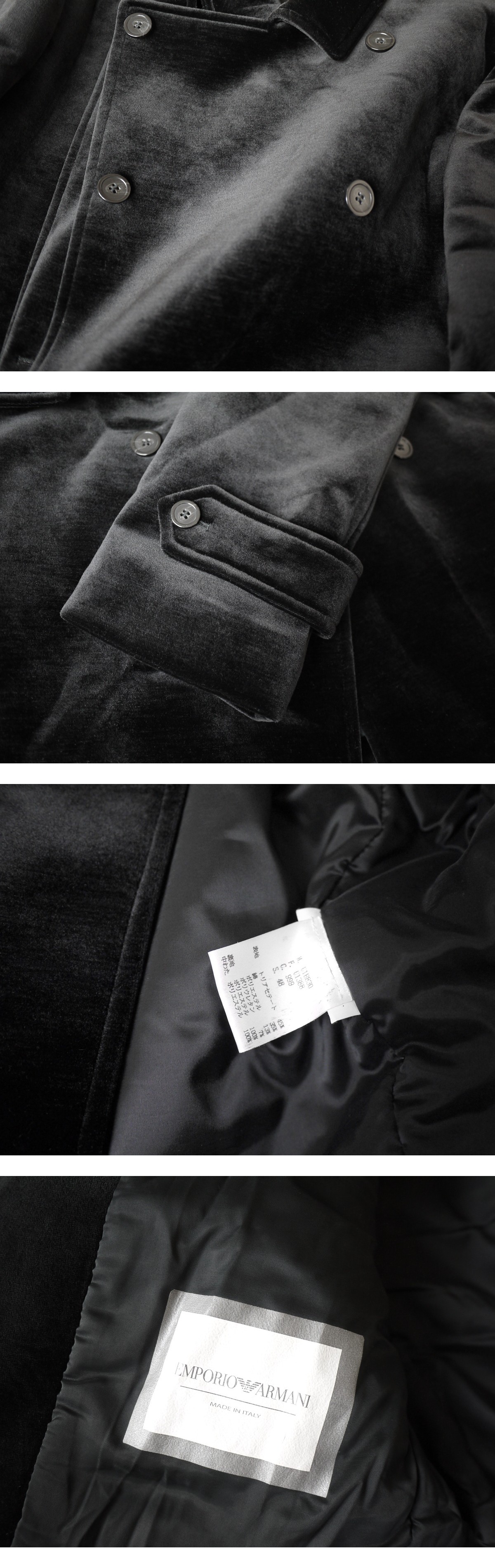 EMPORIO ARMANIのイタリアンベルベットダブルブレステッドコートでございます。エンポリオアルマーニの現行モデル、イタリアトップメゾンの名に恥じない精度の高い製法技術と上質な素材による仕立て、シルエットも身幅に適度にゆとりを持たせたトレンド感のある美しいプロポーションです。