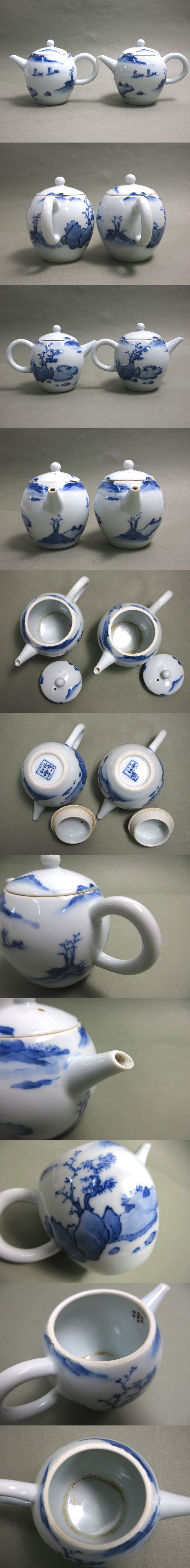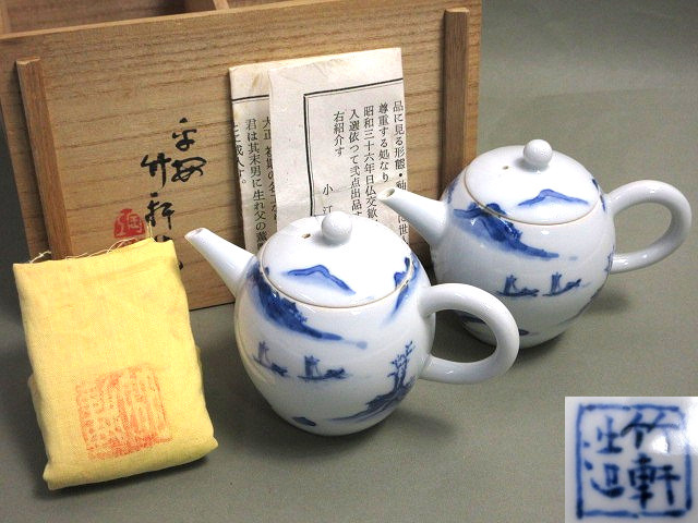 C939 三浦竹軒 造 三代竹泉 青華 山水図 急須 二双 共箱 共布【説明欄に詳細写真有り】 收藏