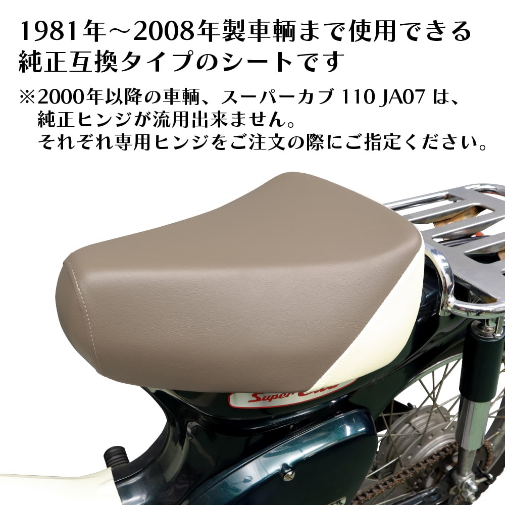 | ■スーパーカブC50/C70/C90 AA01/HA02 ※1(80年以前・JA10/AA04以降は非適合) ■スーパーカブ110(JA07) ※2 ※1 2000年以降のモデルにお使いいただく場合、純正のヒンジが流用できませんので、シートヒンジを合わせてご購入ください。 ※2 スーパーカブ110(JA07型)にお使いいただく場合、純正のヒンジが流用できませんので、シートヒンジを合わせてご購入ください。 *ご注文時にプルダウンにてヒンジが必要・不必要かを選択してください。 *こちらのシートは出荷前に取り付け・外観を検品済です。 |