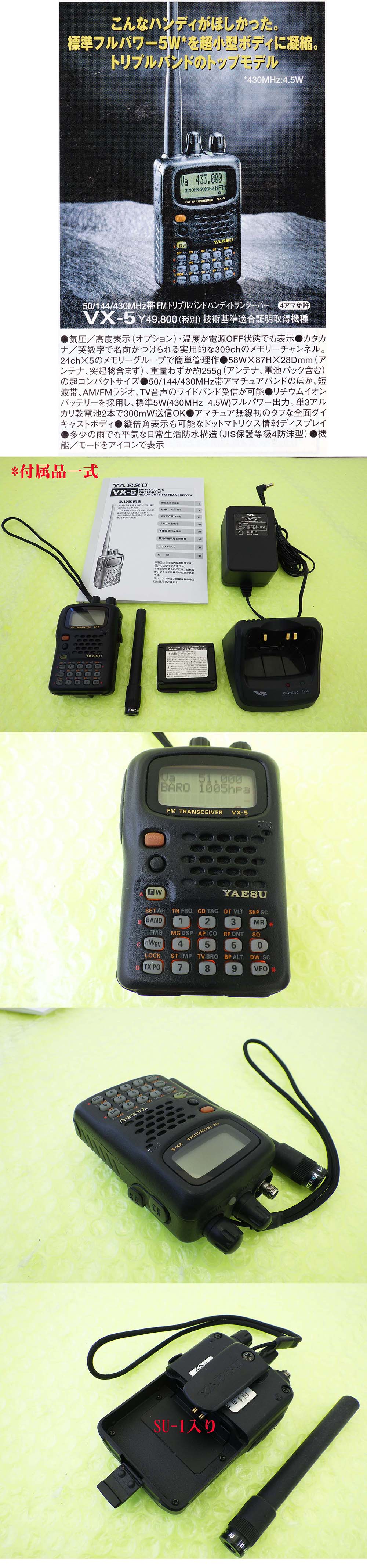 | ◆付属品 | ①取り扱い説明書(コピー) ②ベルトクリップ・ハンドストラップ ③FNB-58Li(充電可能)保証は出来ない ④NC-72A(上記リチウムイオン電池)充電器 ⑤アンテナ(SRH920)50/144/430MHz対応 ⑥SU-1(気圧センサーユニット)組み込み済み *写真の物以外は有りません。 (追加オプション品はないようです) |