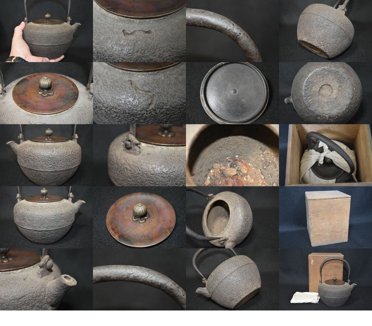 【光成】煎茶用鉄瓶・釜師造「虫喰文・紫斑銅蓋・砲口・小振り鉄瓶」水漏無・京鉄瓶