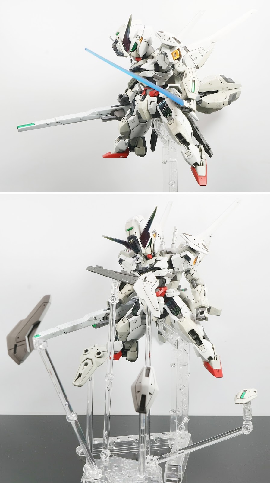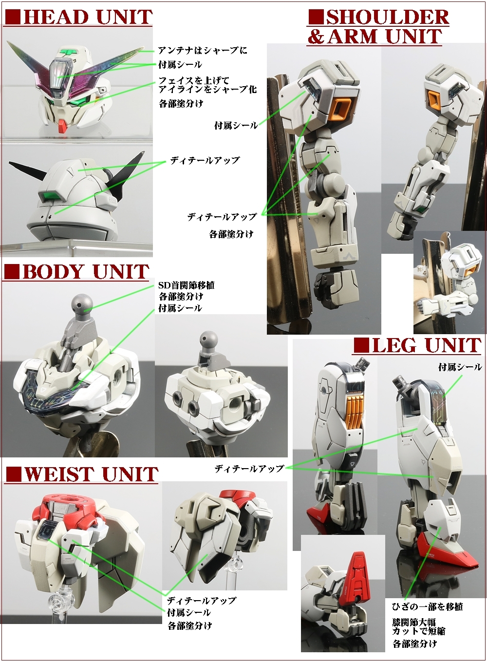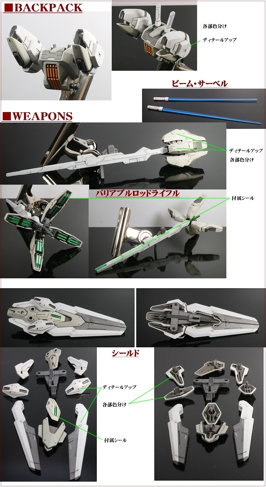 基本処理、サフ終了後 (K=クレオス、G=ガイア) ・ホワイト部 薄⇒ G ニュートラルグレーⅡ ・ホワイト部 薄2⇒ G FS36622 グレー ・ホワイト部 濃⇒ G ライトガルグレー ・レッド部⇒ G エヴァレッド ・イエロー部⇒G 橙黄色 + G ブライトレッド ・グレー部(武器等)⇒ G サーフェイサーEVOガンメタ → G ニュートラルグレーⅣ ■仕上 ・墨入れ:タミヤスミ入れ塗料(ブラック) ・デカール:専用水転写デカール、付属シール ・トップコート:EX-フラットクリアー |