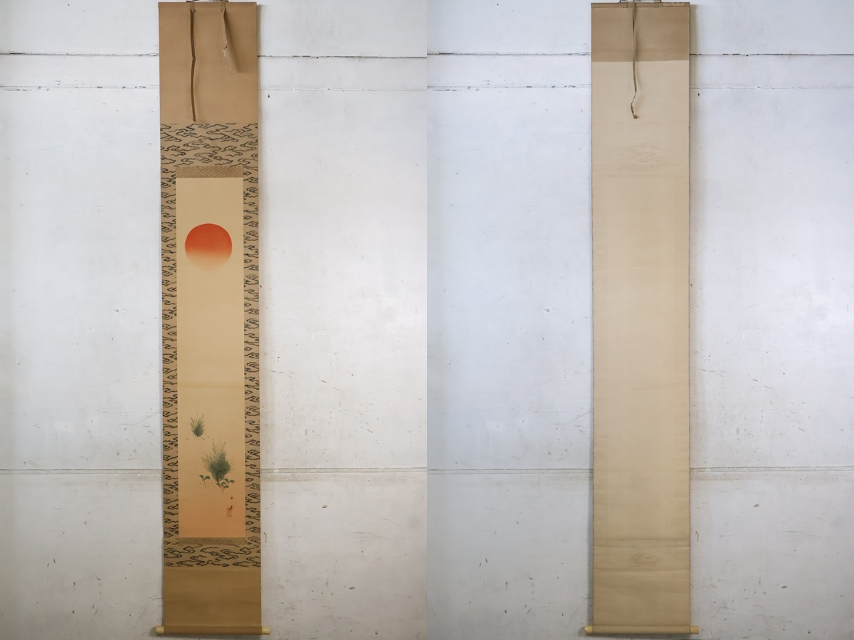 TB526紫園 旭日 若松 掛軸 絹本 共箱◇落款有/南天/慶祝/新年/床掛/掛物/掛飾/日本画/色絵/彩色/工芸/時代/骨董/古美術/古道具タグボート 收藏