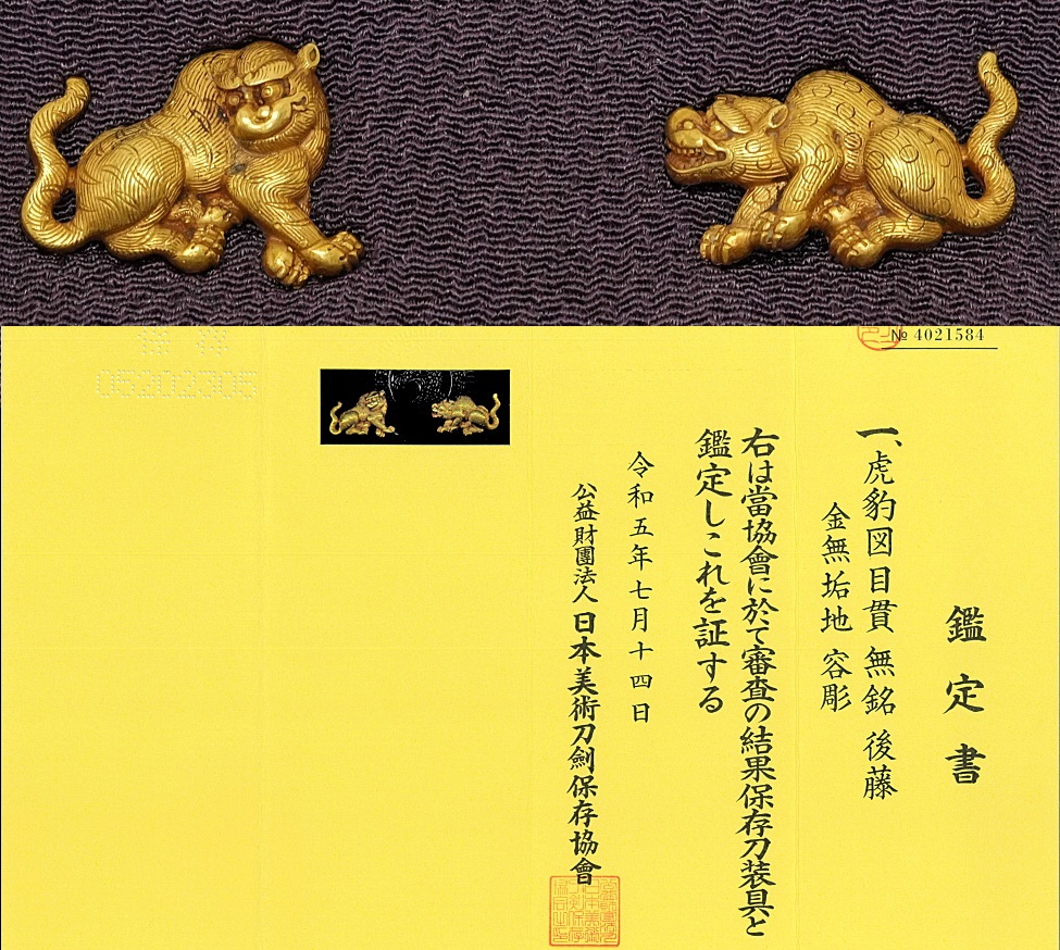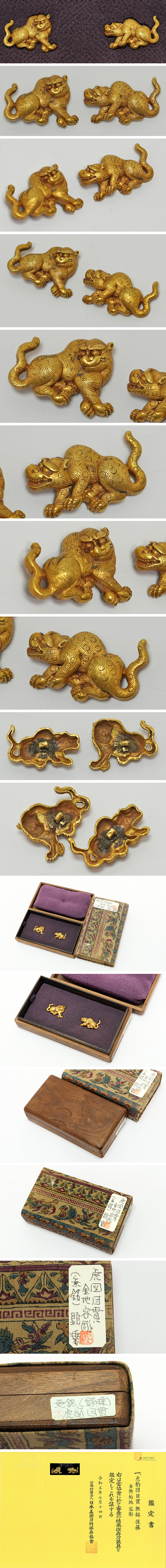 無銘 後藤 金無垢地虎豹図目貫(箱書は顕乗) 上製落し込み桐箱入 保存刀装具鑑定書附 太刀 拵 鍔 小柄笄 目貫 收藏