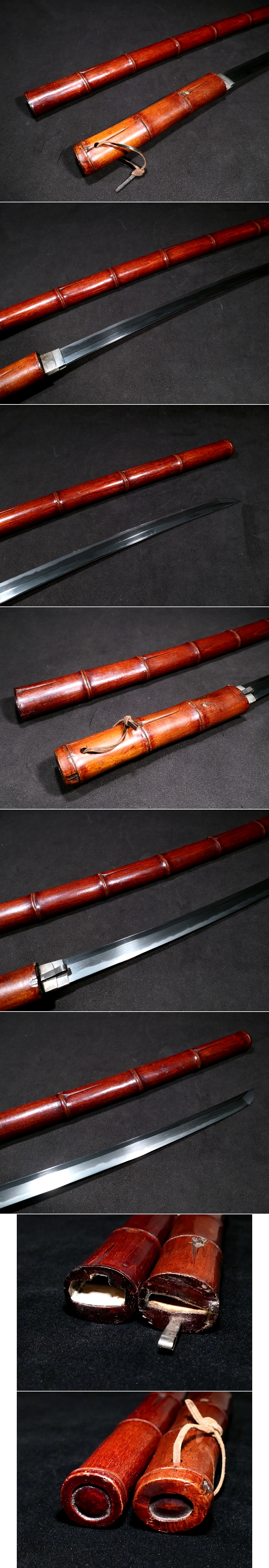 | 商品説明 | 「包吉 康暦元年八月吉日」在銘の脇差のご紹介です。 竹の杖に模した仕込み杖(仕込み刀)となった 拵えに納められています。 中身の銘は名前と年紀から推測するに、 南北朝期に活躍したと言われる 大和手掻派の包吉の事でしょうか。 「康暦」は南北朝期に北朝で使用された元号です。 中身の状態は全体的に見て概ね良好です。 多少の鍛え傷や汚れ等はございます。 古い物ですので多少の時代傷みはご理解下さい。 詳しくは画像にてご判断下さい。 神経質な方は入札をご遠慮下さい。 ※当方は刀剣類に関しましては、あまり知識が明るくない為、 ご質問を頂きましても、あまり回答する事が出来ないと思います。 詳しい時代や銘、状態等に関しましては画像でご判断頂き、 納得の出来る範囲内で入札に御参加頂ける様、よろしくお願いします。 |