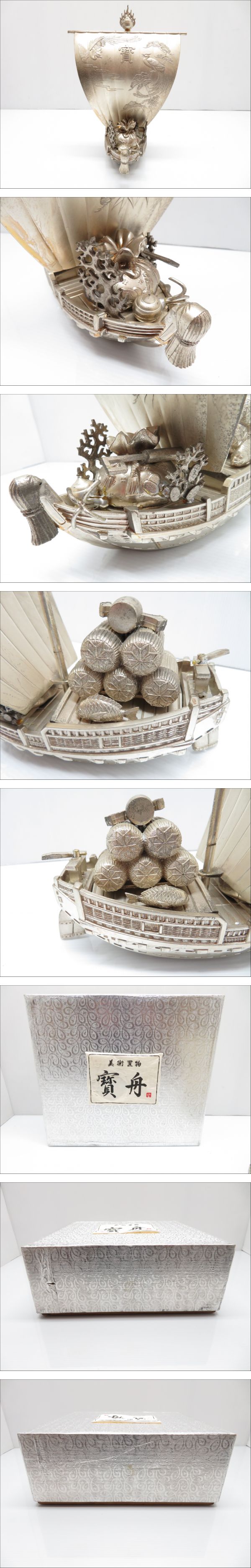 美術置物 寳舟 宝船 全長22cm/重量1641g 金属工芸/置物/縁起物/銀メッキ/米俵/珊瑚/魚/開運/銀色/シルバー 元箱付き 寳 收藏