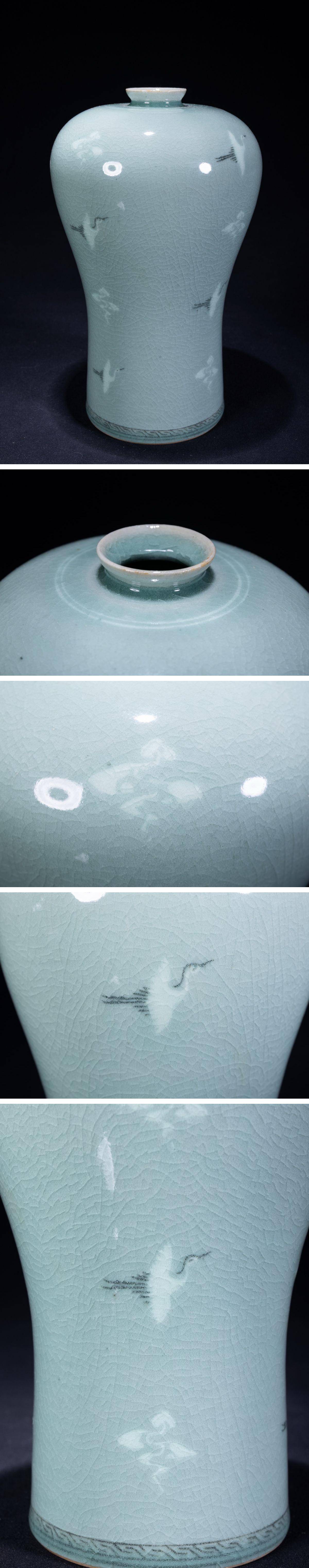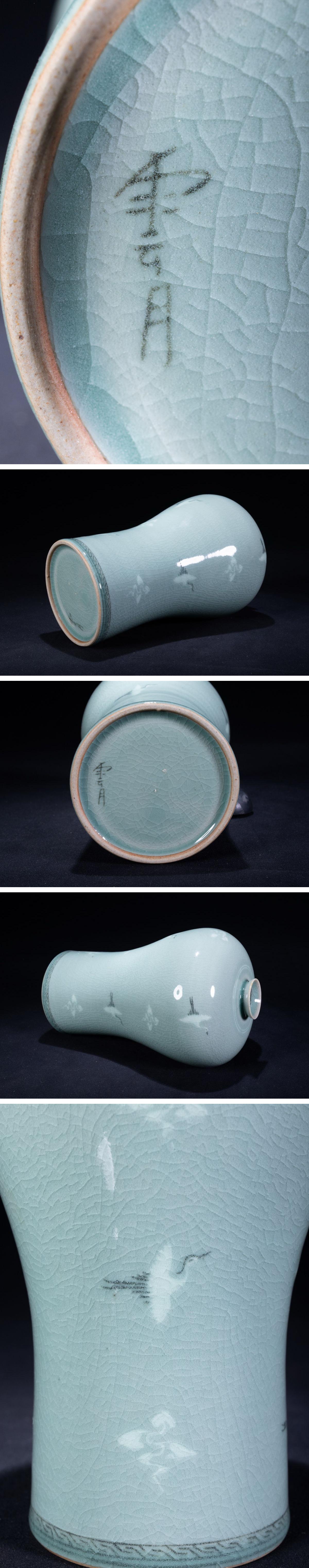 【珍品堂】1円から 高麗 雲月 在銘 青磁 象嵌 鶴紋梅瓶 花瓶 壺木箱 骨董品 時代物 古美術 H20cm N-A92C-SR2 收藏