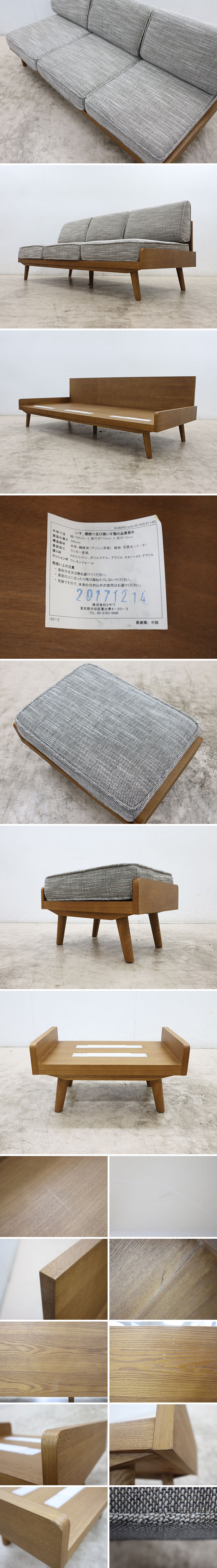 ソファ材質:カバー/ポリエステル・コットン・レーヨン・ナイロン・アクリル、背・座/ウレタンフォーム、フレーム/アッシュ突板、脚部/バーチ