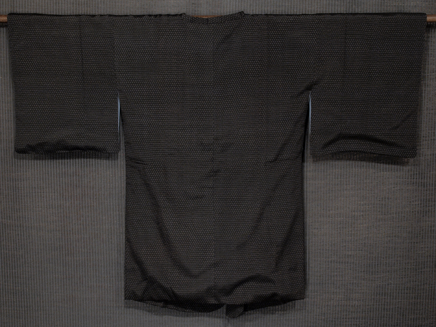 ほぼ黒色に見える憲法黒茶色の地に、絣で十字の文様が織り込まれている、お召しの道行コートです。袷仕立てです。 昭和初期ごろにつくられたと思われるアンティークお品です。アンティークのものなので、強撚糸のシャリ感はややありますが、やわらかな地風です。シックで粋な趣きが感じられます。 ところどころにこまかな節があります。袖と身ごろ下部がややダブつき気味です。経年による若干のくすみなどはあるかもしれませんが、目につくしみやよごれ、褪色などのダメージはなく、この時代のものとしてはきれいな状態です。 |