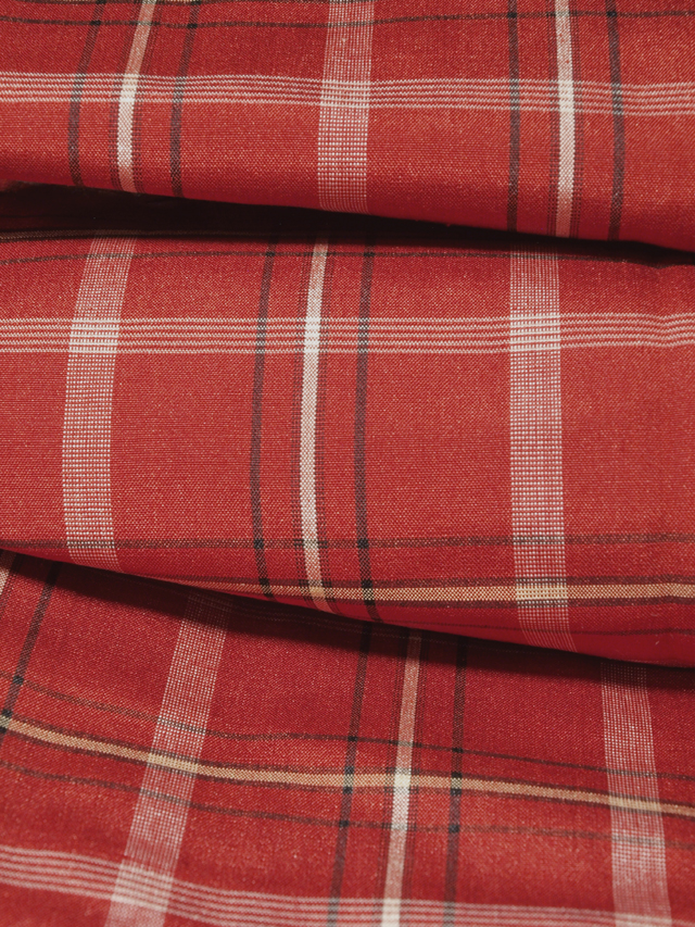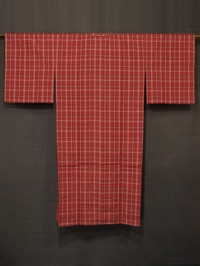 やや沈んだ猩々緋(しょうじょうひ)色といった感じの地に、格子縞の文様が織り込まれている、紬の雨コートです。単衣仕立てです。 小粋なお色目です。ややさらりとした、やや大島紬に似た地風の紬地です。 しつけ付きの仕立て上がり未使用保管品で、しみやよごれ、褪色などのダメージもありません。新品同様です。 |