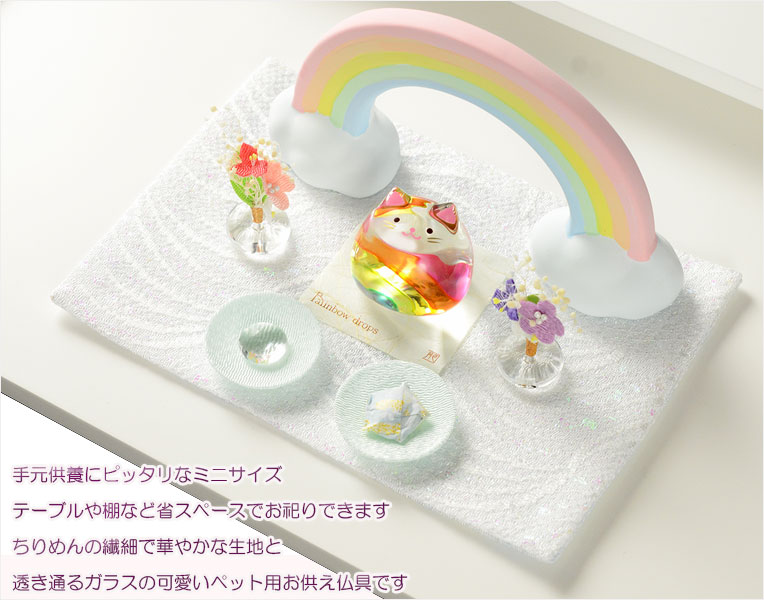 ペット用仏具【国産京都:虹色ガラス+金襴ちりめん お供え7点セット プリエ ニャンちゃん用 ミニサイズ】 送料無料 收藏