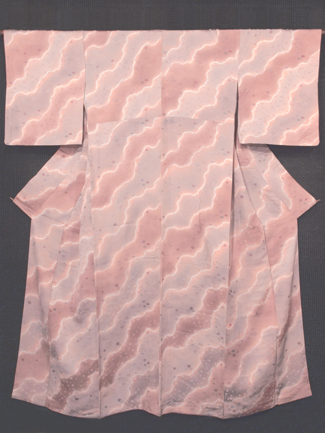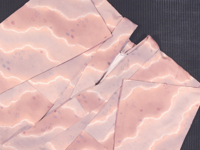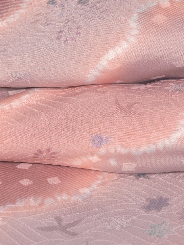 やや沈んだごく淡い珊瑚(さんご)色の地に、波と切り箔散らし、鳥と草花の地紋が織り出され、縫い絞り染めでごく淡い薄鼠(うすねず)色のぼかしの文様が施されている、紋綸子縮緬の小紋です。袷仕立てです。 草花の地紋には淡い紫色、淡い青緑色、淡い赤紫色の挿し色が染められていて、はんなりとした印象を醸しています。 ユーズド品ですが、あまり使用感は感じられません。目につくしみやよごれ、褪色などのダメージも見あたらず、とてもきれいな状態です。 |