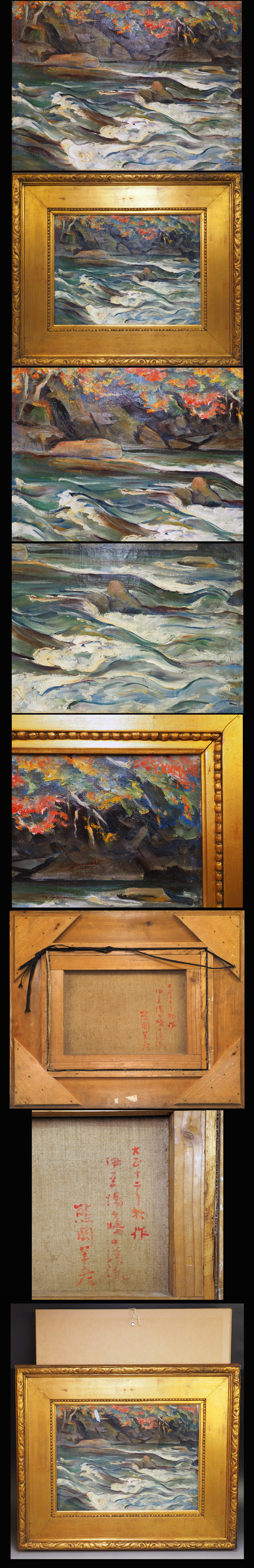 ![]() 熊岡美彦の紅葉渓流を描いた油彩画 「伊豆湯ヶ嶋の渓流」 です。 大正12年(1923年)の作品です。 表サイン・裏書あり。 【状態】 キャンパス・油彩 作品は経年による細かい絵具の割れ、キャンバスのゆがみがあります。 額も古い額でキズや割れ等の劣化があります。 詳細は写真でご判断下さい。 段ボール外箱つき。 【サイズ】 作品サイズ:約 縦 27.2cm × 横 37.8cm(5~6号サイズ) 額装サイズ:約 縦 48cm × 横 58cm こちらの作品は真作保証の安心頂ける作品であることをお約束いたします。 不明な点は、入札前に質問等でご確認下さい。 熊岡 美彦(くまおかよしひこ) 茨城県石岡市に生まれる/1913年東京美術学校卒業、第2回光風会展に出品、受賞、第7回文展で初入選/1914年第8回文展に入選/1915年第9回文展で褒状/1921年第3回帝展で特選/1924年槐樹社を結成/1925年第6回帝展で帝国美術院賞/1926年渡仏/1929年シベリアを経て帰国/1931年熊岡洋画研究所開設/1932年東光会結成/1944年東京の自宅で死去 | |||