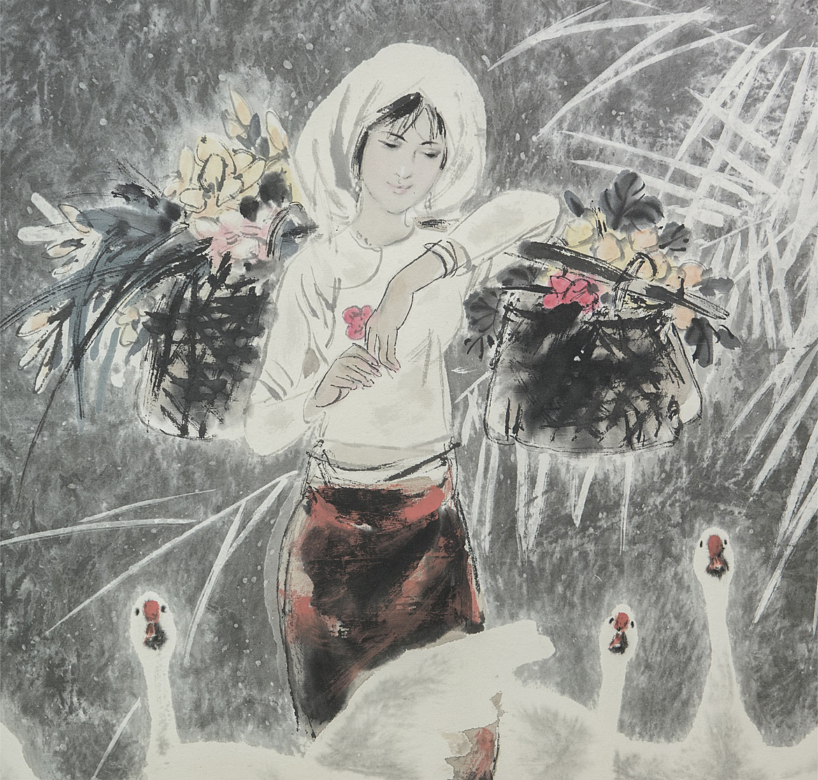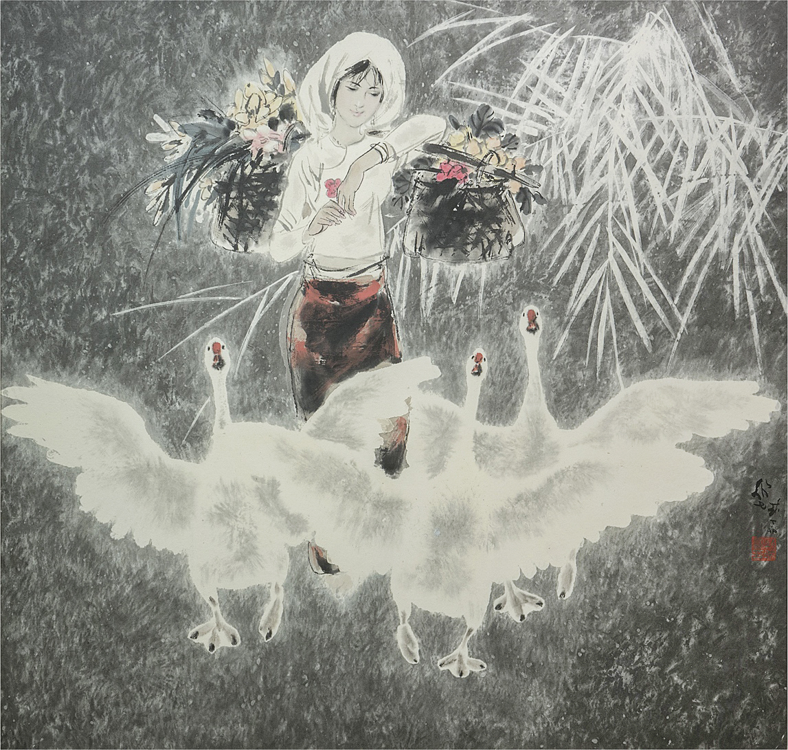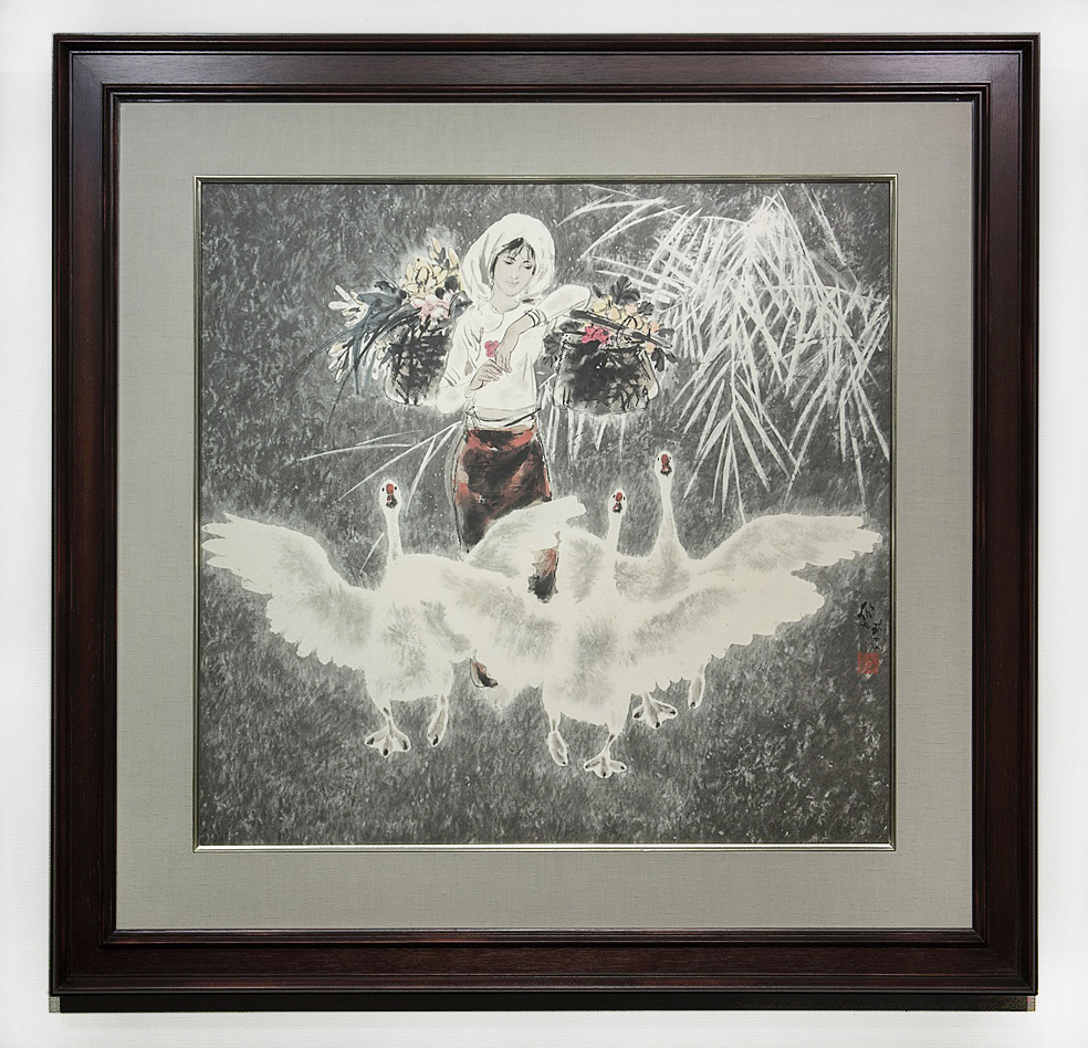 張紹城 1987年作 牧鵝図 額装 真作保証 张绍城 中国 近現代絵画 現代美術 收藏