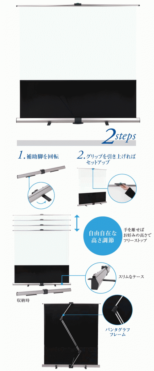 ●簡単な2ステップのセットアップ(1:補助脚を回転 2:グリップを引き上げる)