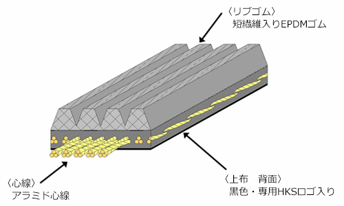 ◆短繊維を配合した上で、リブゴムに採用することにより、あらゆる面で旧タイプの材質ベルトでは得られない効果を発揮します