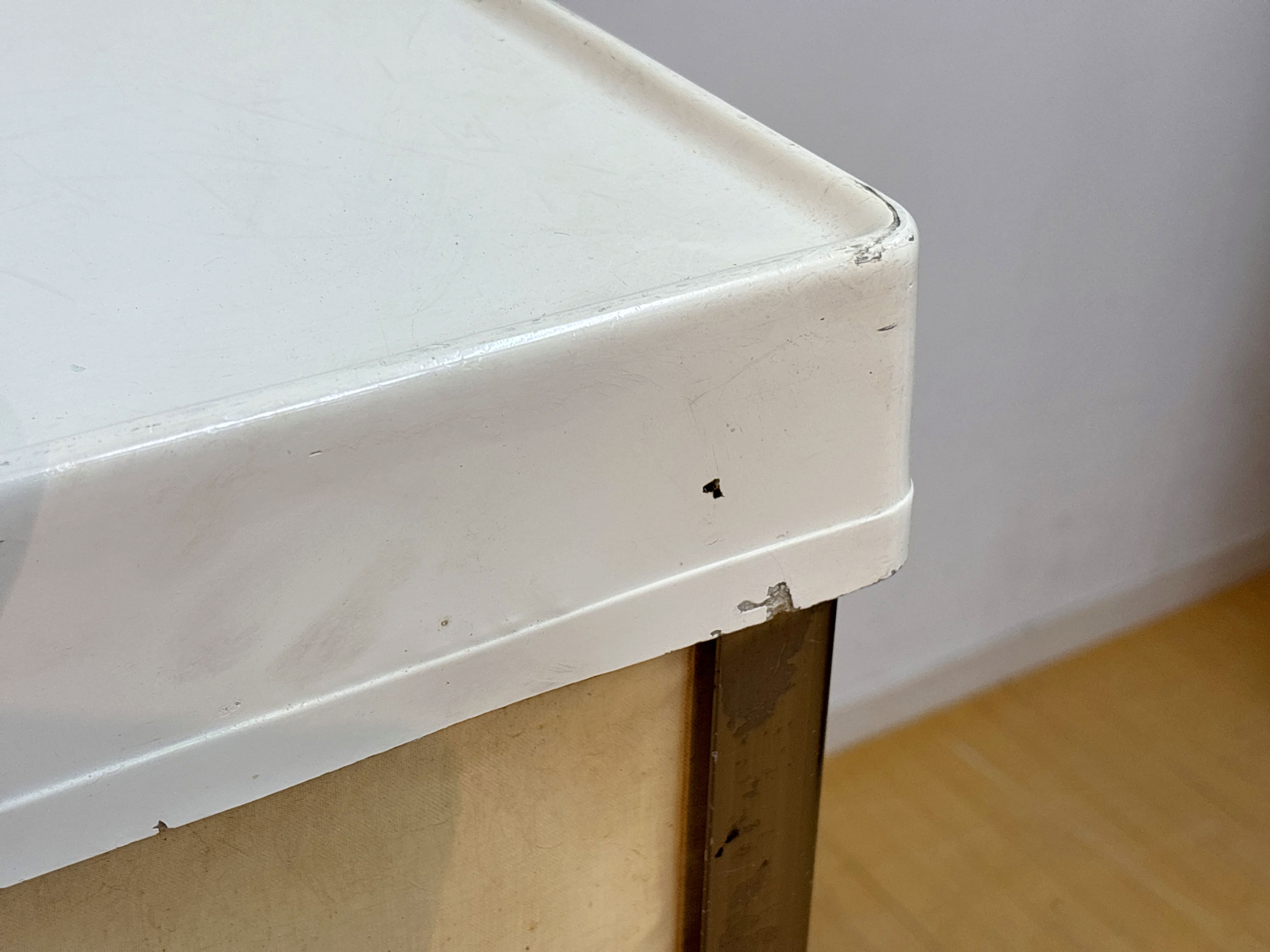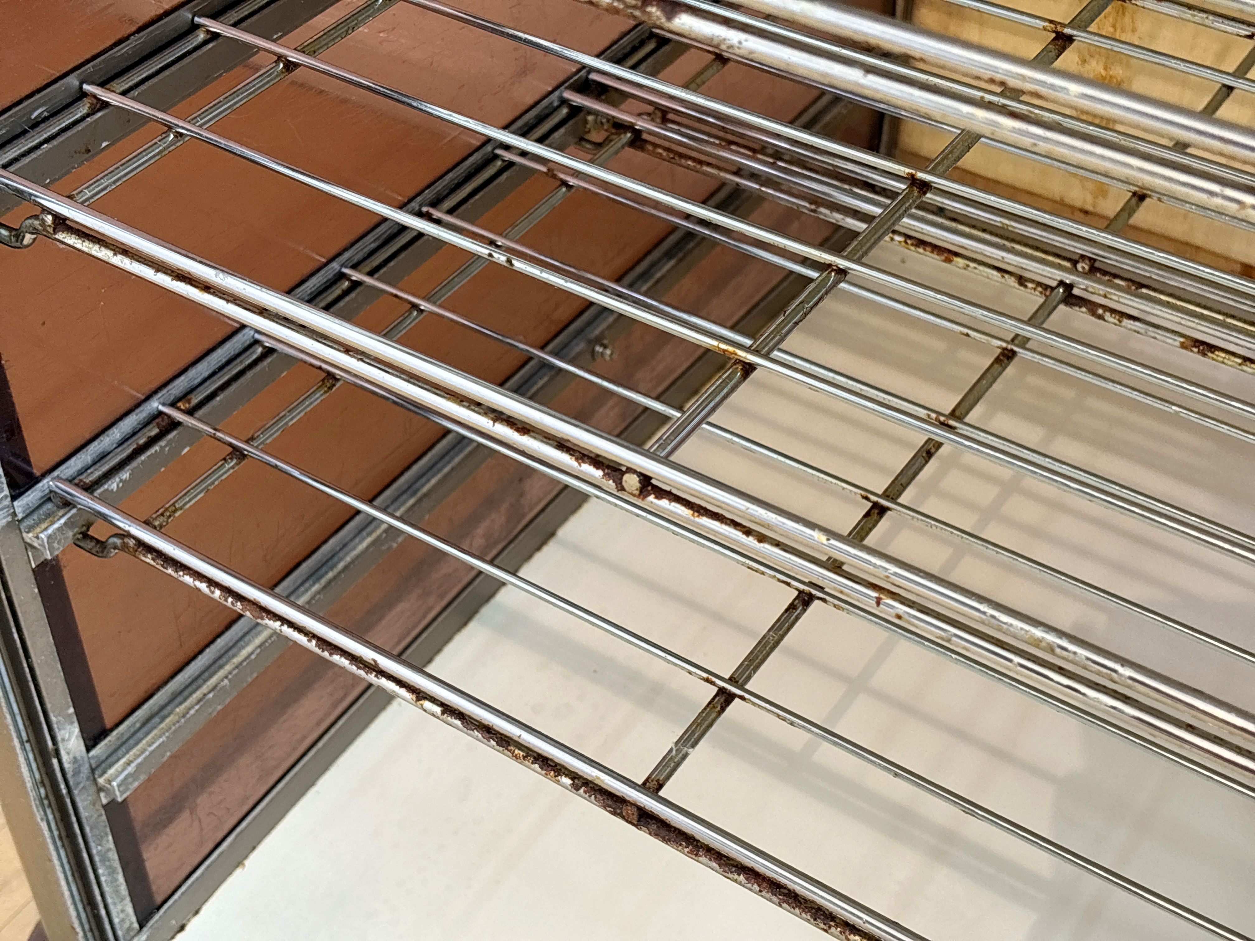 こちらは ERECTA エレクター ワゴン 配膳車 です。 中古品です。 【ERECTAについて】 ERECTA(エレクター)は、1966年に創業の、東京に本社を置く企業です。 収納・保管・搬送を機能的に融合したワイヤーシェルフをはじめとした シェルフ類、カート、移動棚などのメーカーです。 食品・医療・物流・研究機関をはじめ各業界の厳しい要求を満たす高品質な製品を作っています。 今回はそんなエレクターの、ワゴンが入荷しましたので出品致します。 特徴としましては以下のようなことが挙げられます。 ◆大容量の収納 6段分収納でき、大規模な運搬でもカンタンにこなすことができます。 ◆ロール式シャッター搭載 左右両面に、上下にスライドできるカーテンが付いており、積載物の飛び出しを防げます。 ◆現場での安全・安心設計 下部に全周囲のバンパーがあり、万が一の衝突の際にも怪我や物の破損を防止できます。 また再良市場ではワゴンを複数同時出品中です! 下記リンクよりそちらもぜひ併せてご覧ください!(2025/07/17現在) ![]() 【各部サイズ】 ※同型別個体の画像を使用しています。 【コンディションについて】 コンディションにつきましては以下の画像も併せてご覧ください。 ![]() 【ワゴン樹脂部分 小キズ】 ![]() 【棚板 サビ痕・金属臭】 ![]() 【側面 ヒビ】 その他、使用感に伴い、小キズや取り切れないテープ痕などがあり、 棚板が1枚欠品していますが、 配膳する上で使用を損なうレベルの割れ、キズなどはなく、車輪の回転も良好で、 運搬用のワゴンとして問題はありません。 まだまだ長きにわたってお使いいただけるお品です。 収納性に富んでいて、下部には防壁用ゴムを備えており、安全面でも優れています。 業務用の運搬用カートとしていかがでしょうか。 是非この機会にご検討ください。 皆様のご入札をお待ちしております! ワゴンを複数同時出品中!(2025/07/17現在)
