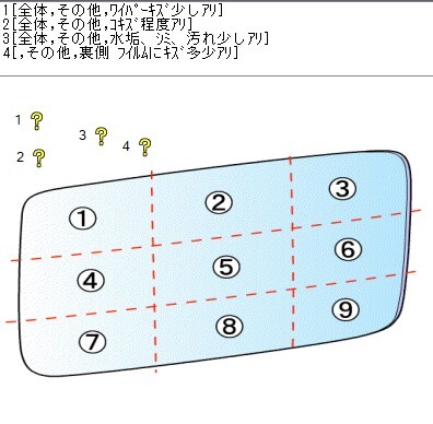 [全体、その他、ワイパーキズ少しアリ][全体、その他、コキズ程度アリ][全体、その他、水垢、シミ、汚れ少しアリ][、その他、裏側 フイルムにキズ多少アリ] | |