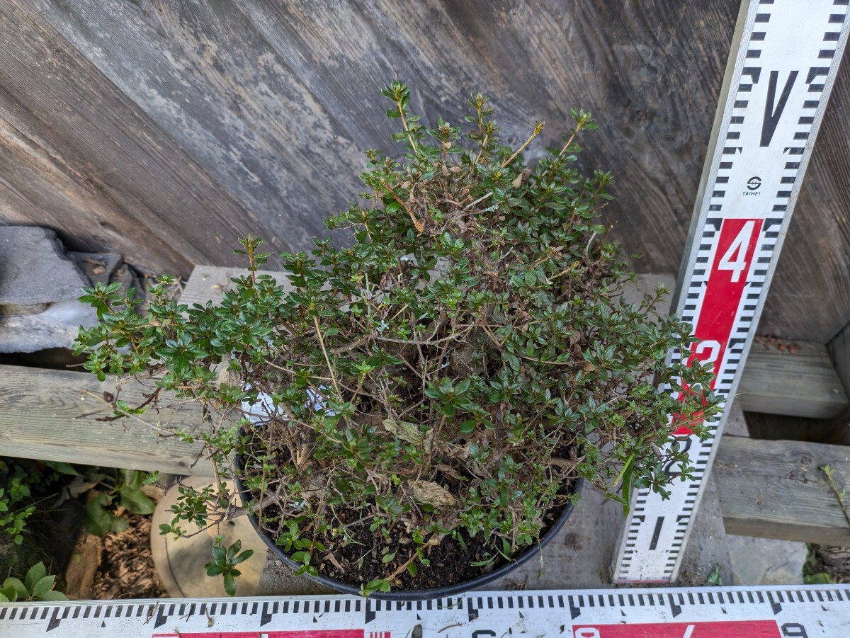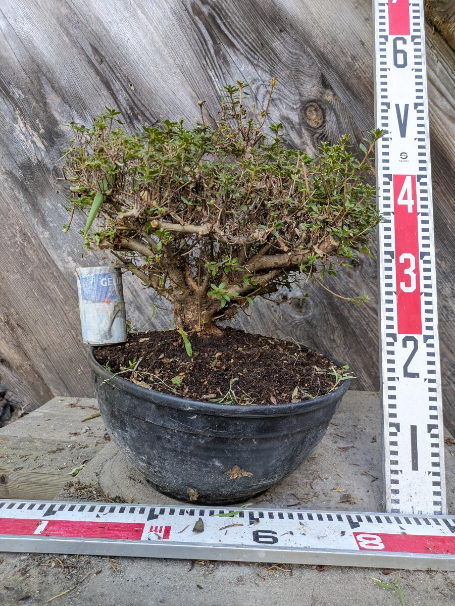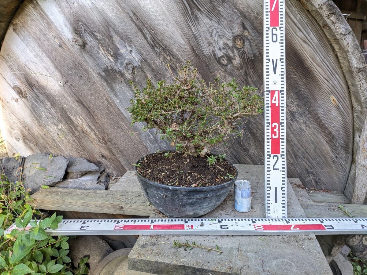およそは40x40x50cmの枠に入るサイズ。根本付近からの高さは35cmくらい。合ってるとは思いますが品種間違いしてたらスミマセン(返品不可) 10年くらいかけて メートルを超えた広さに育った株を枝を切っては胴吹きでコンパクトにした古木です。花芽有りでプラ鉢入り。発送梱包の際に痛むヶ所が有るかもしれません。佐川急便にて発送する事も有ります。