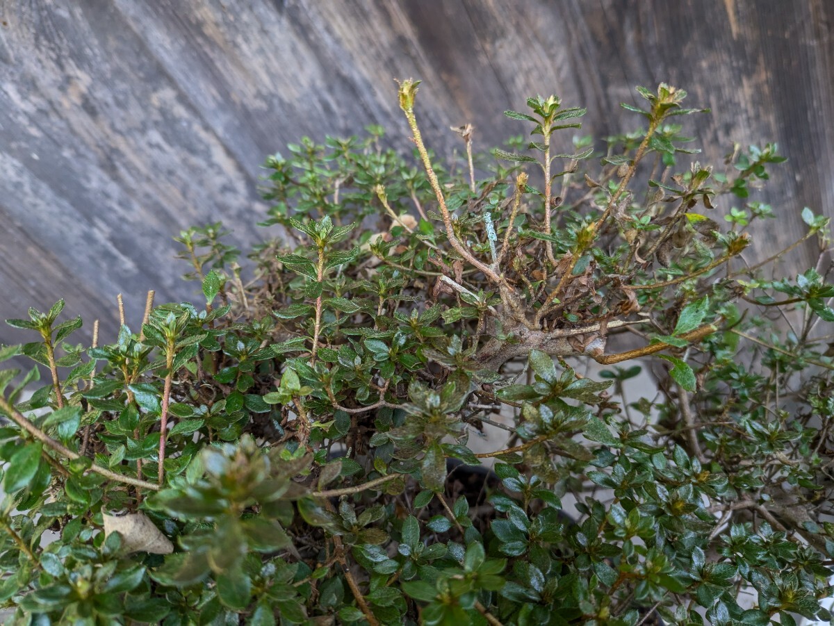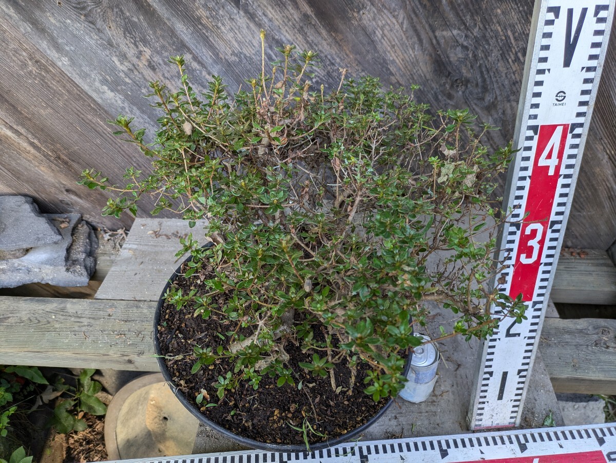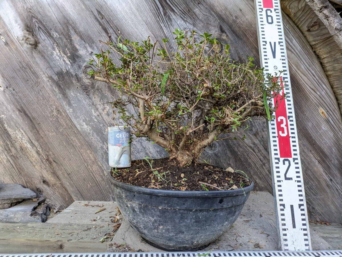 およそは40x40x50cmの枠に入るサイズ。根本付近からの高さは35cmくらい。合ってるとは思いますが品種間違いしてたらスミマセン(返品不可) 10年くらいかけて メートルを超えた広さに育った株を枝を切っては胴吹きでコンパクトにした古木です。花芽有りでプラ鉢入り。発送梱包の際に痛むヶ所が有るかもしれません。佐川急便にて発送する事も有ります。