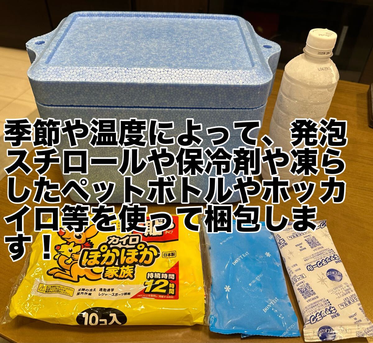 今の時期はその日の気温を考えて発泡スチロール箱に入れて保冷剤を入れてという梱包をしないでダンボールに直接入れて新聞紙等で固定して発送する事もあります!!!