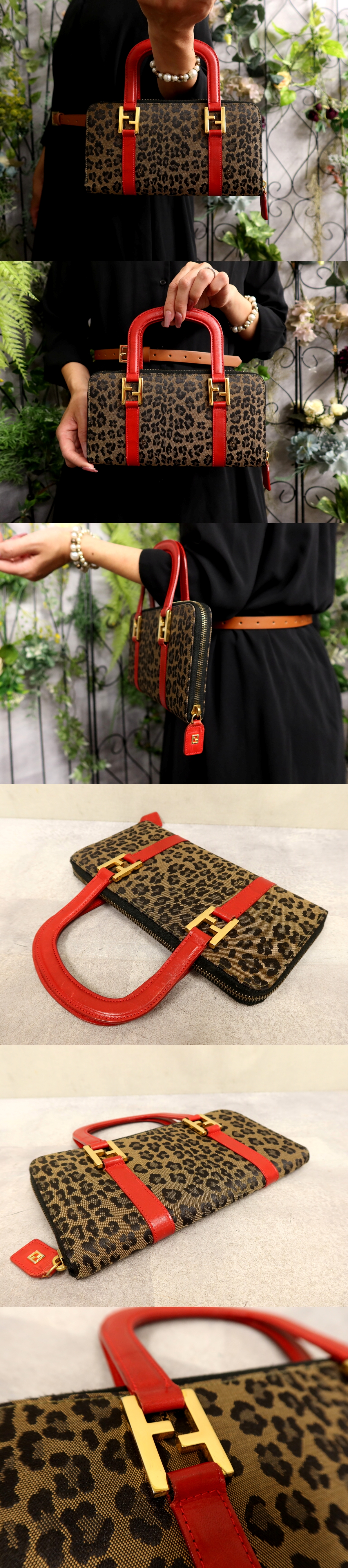超美品●FENDI フェンディ●FF金具●レオパード柄●キャンバス カーフ レザー 本革●ハンド バッグ●ブラウン系 赤●ゴールド金具●Js60818 收藏