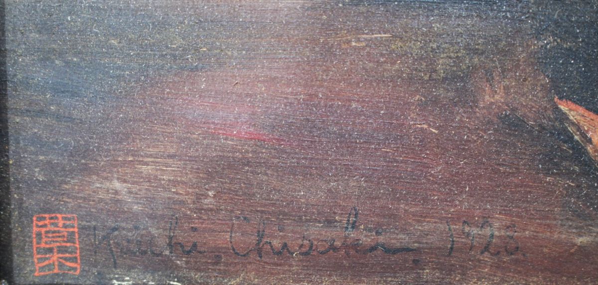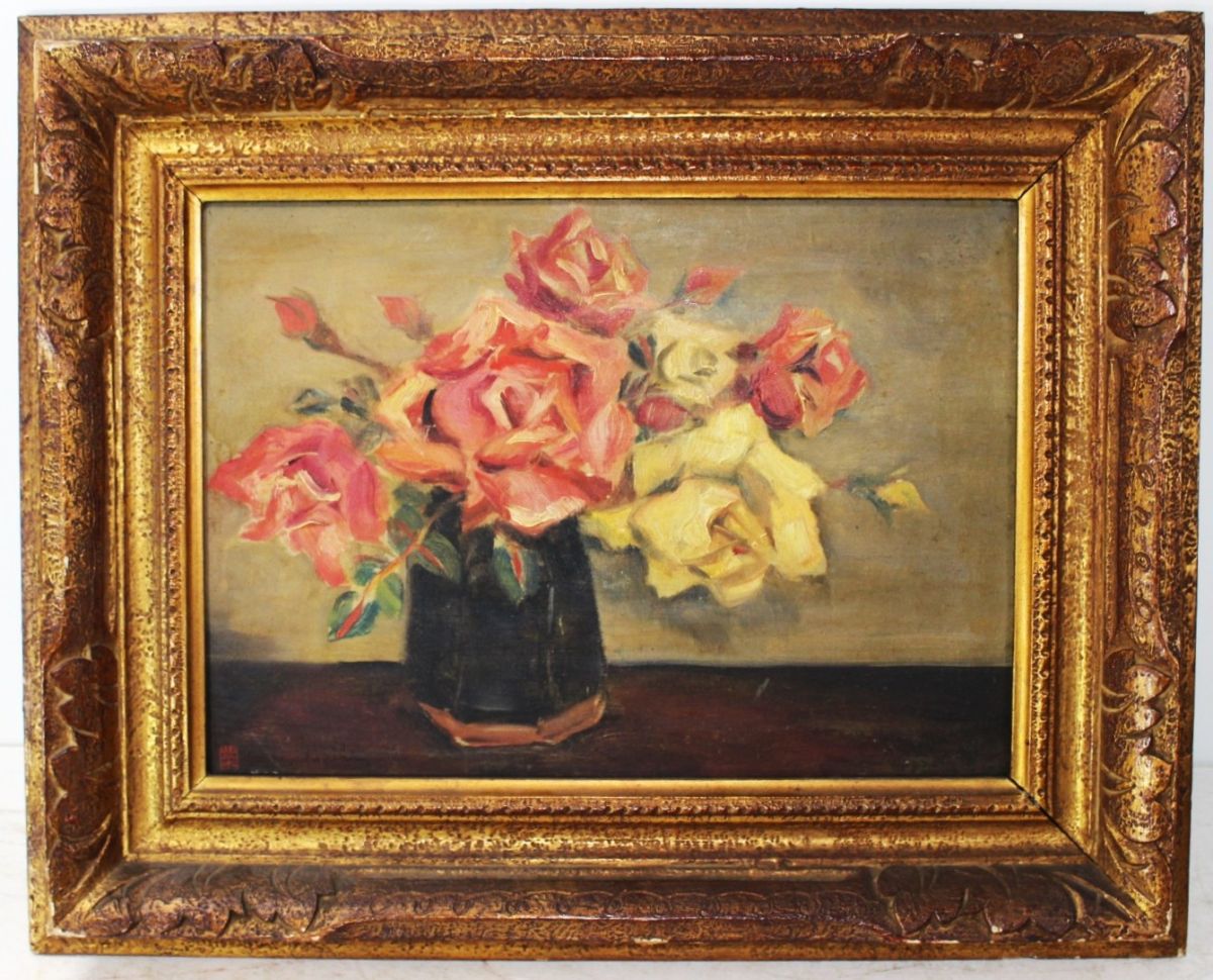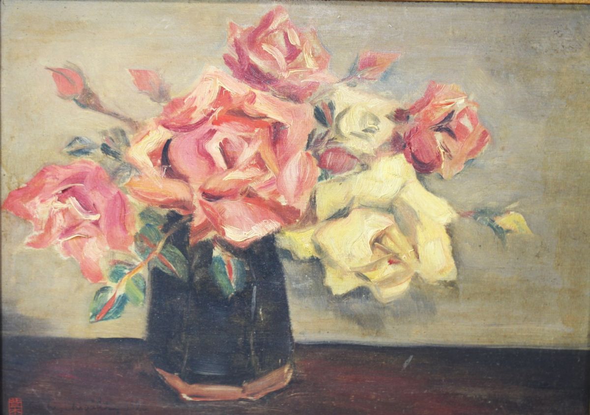 《真作》★苣木 九市 (ちさき くいち)【ばら】1928年作.板絵.古い油絵*戦前作品.珍品*時代感.レトロ*花生けに薔薇の花*[桃] 收藏