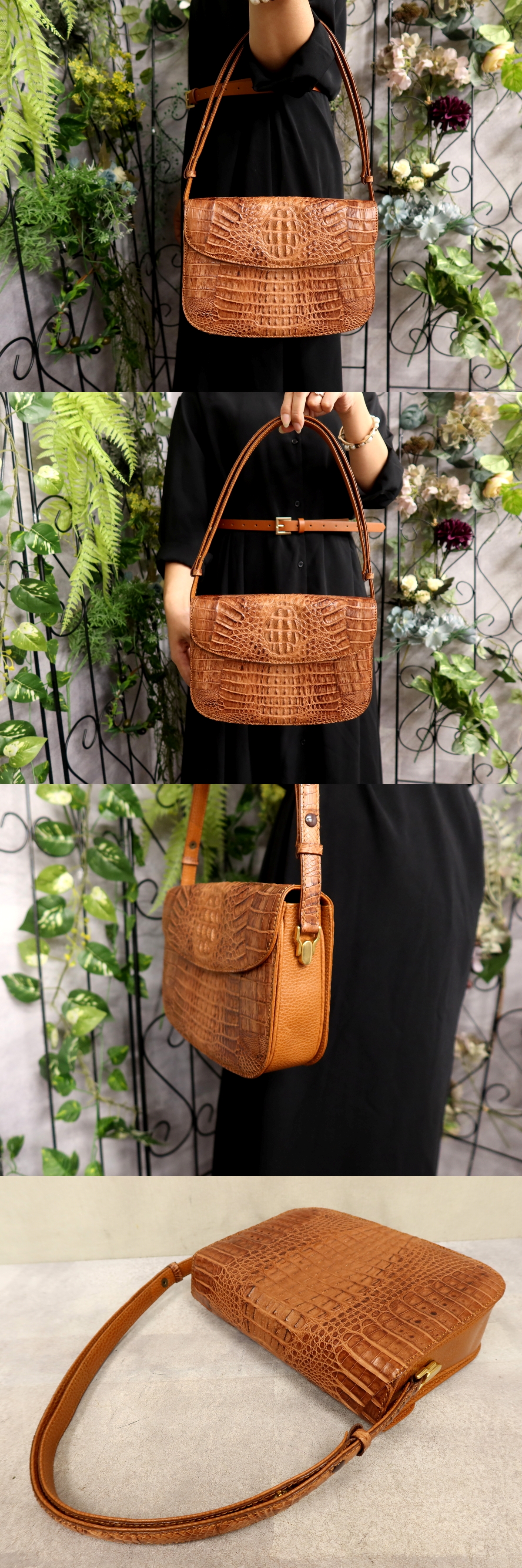 ●超美品●GENUINE●フラップ●クロコダイル 本 ワニ 革●ショルダー ハンド バッグ●ブラウン●ゴールド金具●腕掛け●かばん●Js61444 收藏