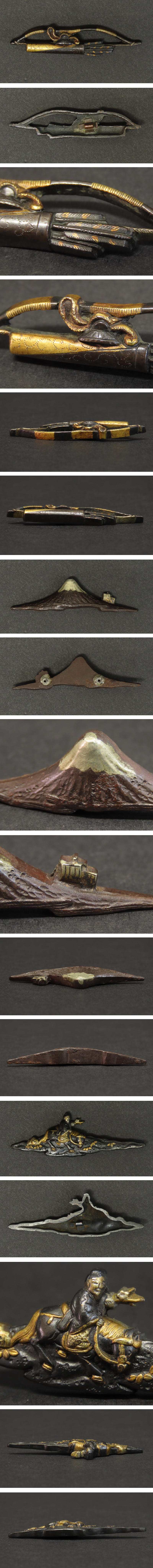 【月】【目貫 縁頭 特集068】銅地・鉄地目貫3点 弓矢図 富士山図 騎馬図 金銀象嵌 / 刀装具 武具 刀剣 金工 鉄鍔 收藏