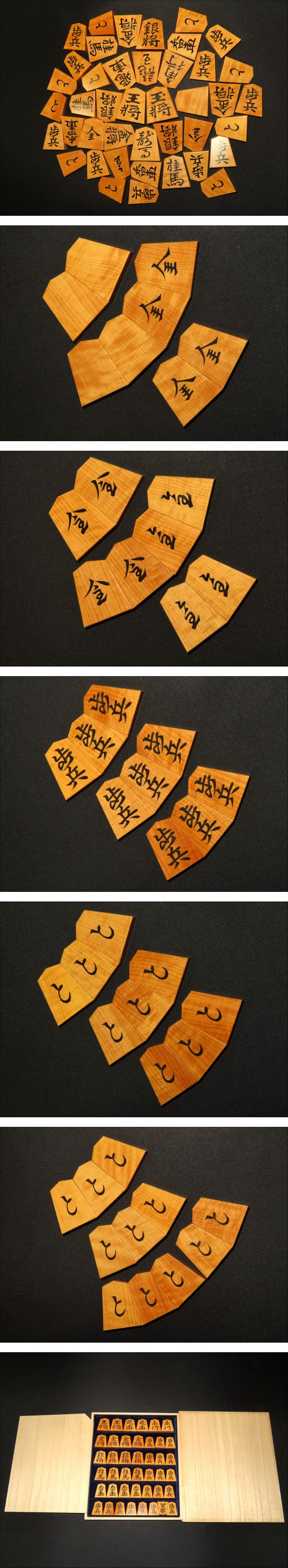 木地は本黄楊赤柾。ご覧の通り非常に味の良い木地です。中国産黄楊です。全ての駒の表裏をUP致しましたので是非ご覧下さいませ。
