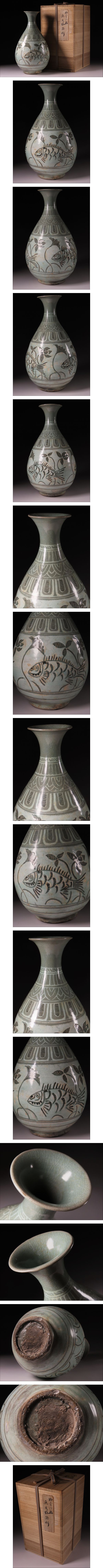 朝鮮美術 朝鮮古陶 高麗 李朝 高麗青磁 粉青沙器 白黒象嵌 魚文徳利 花瓶 梅瓶 高30.7cm 保管箱付 李氏朝鮮 韓国美術 | |||