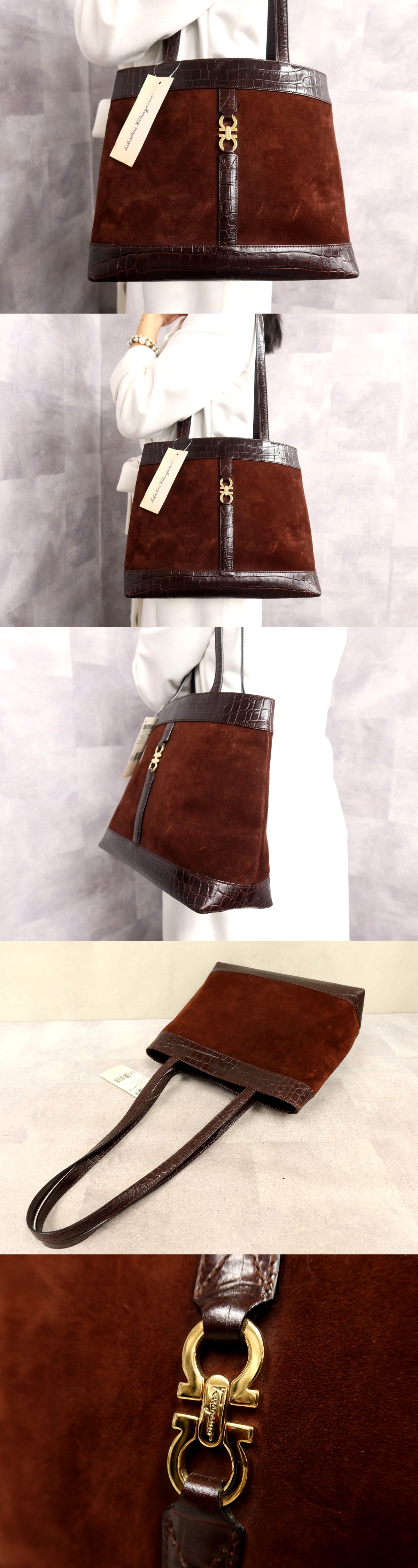 ●超美品●フェラガモ●ダブルガンチーニ●スエード クロコダイル 型押し レザー 本革●ショルダー バッグ●ブラウン●G金具●B5●Js62406 收藏