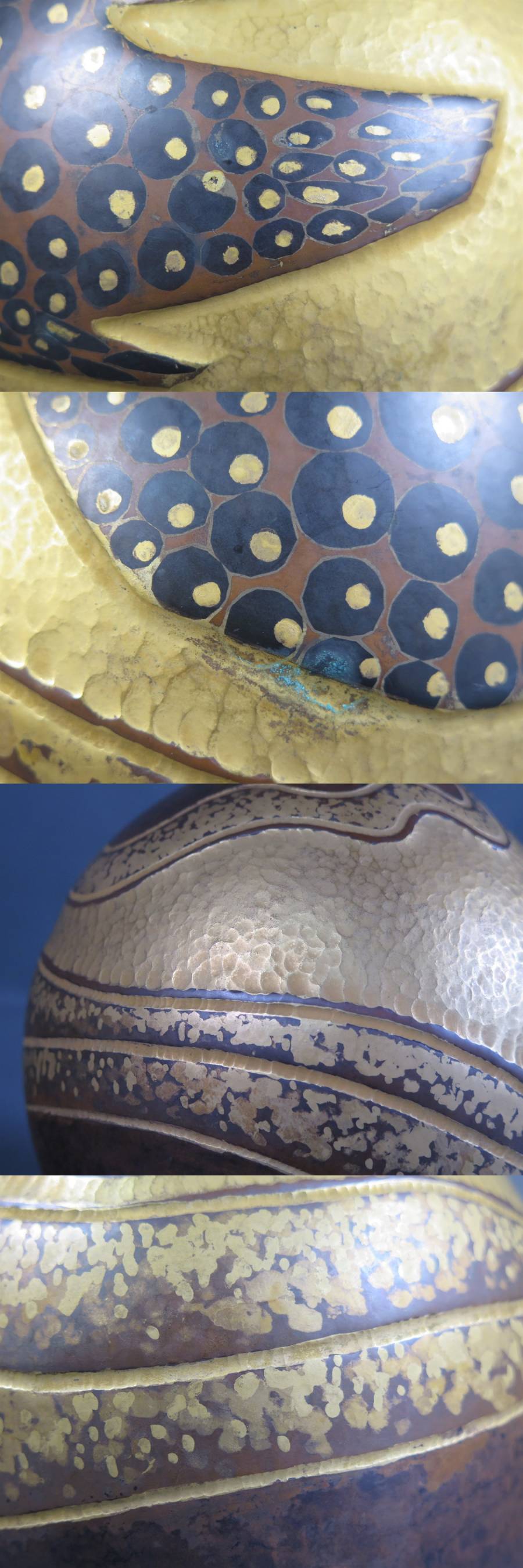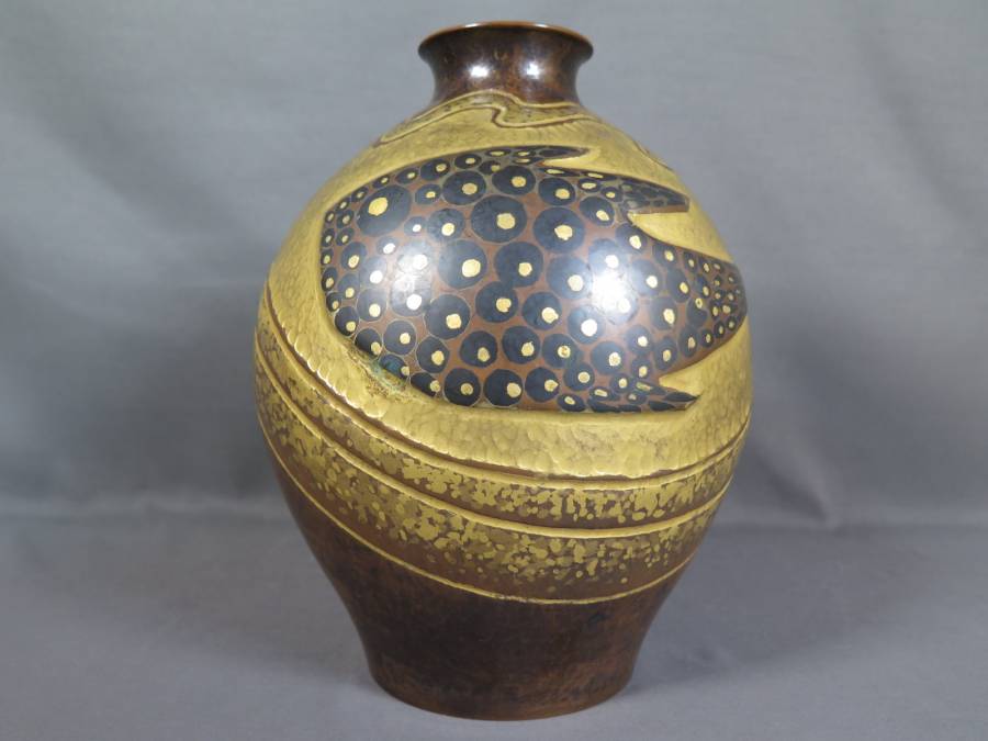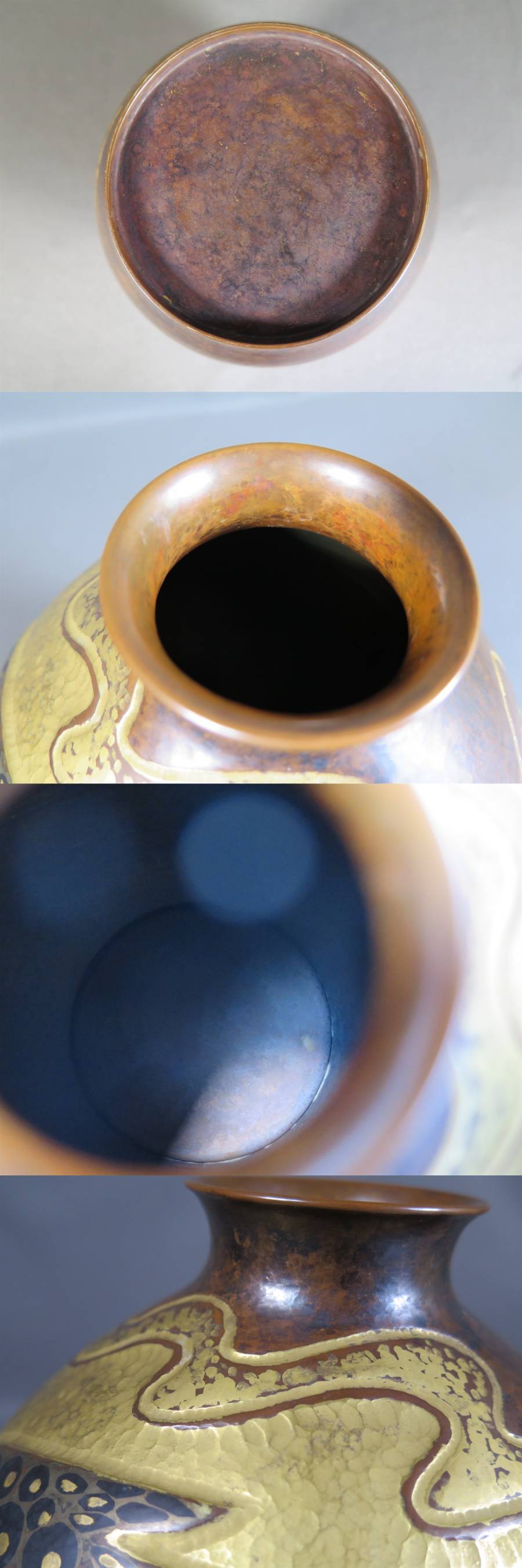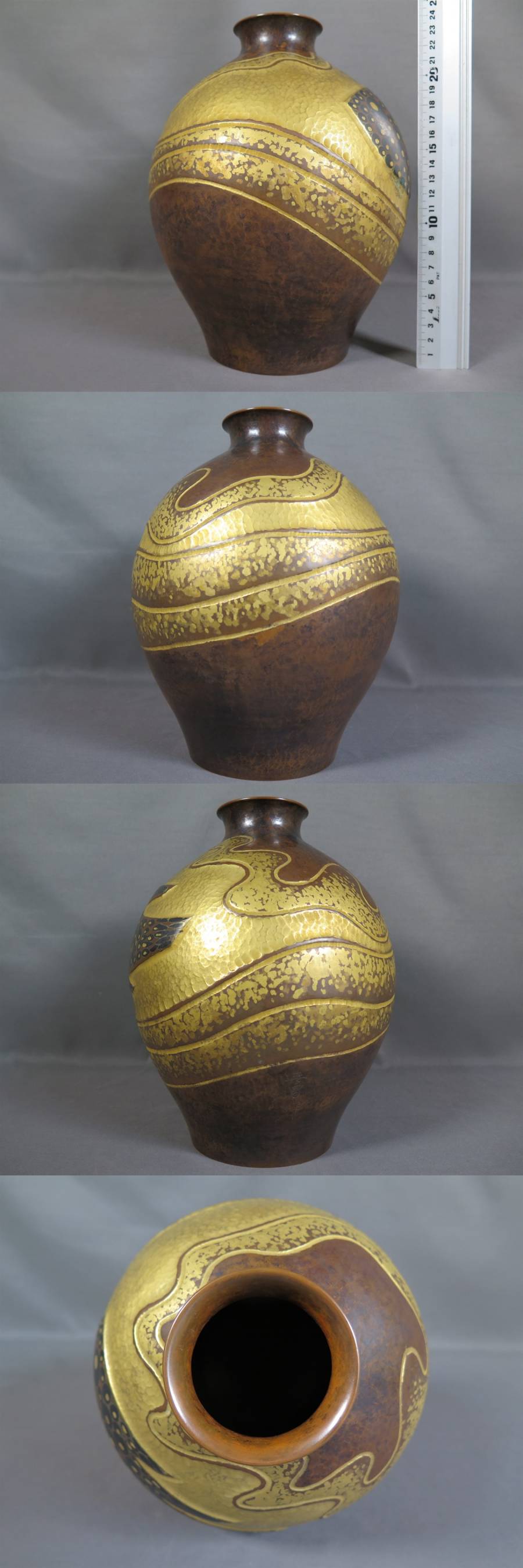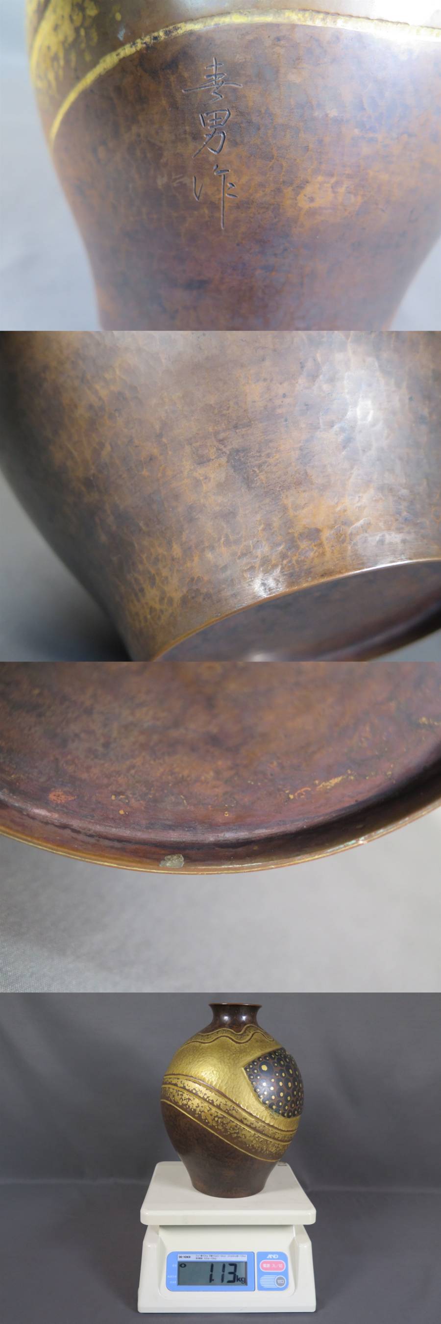 銅製 花瓶 在銘 寿男 作 金色/ゴールド 魚文 高さ約21cm★花器 花生け 花入れ フラワーベース 壺 置物 オブジェ 伝統工芸 金属工芸 收藏