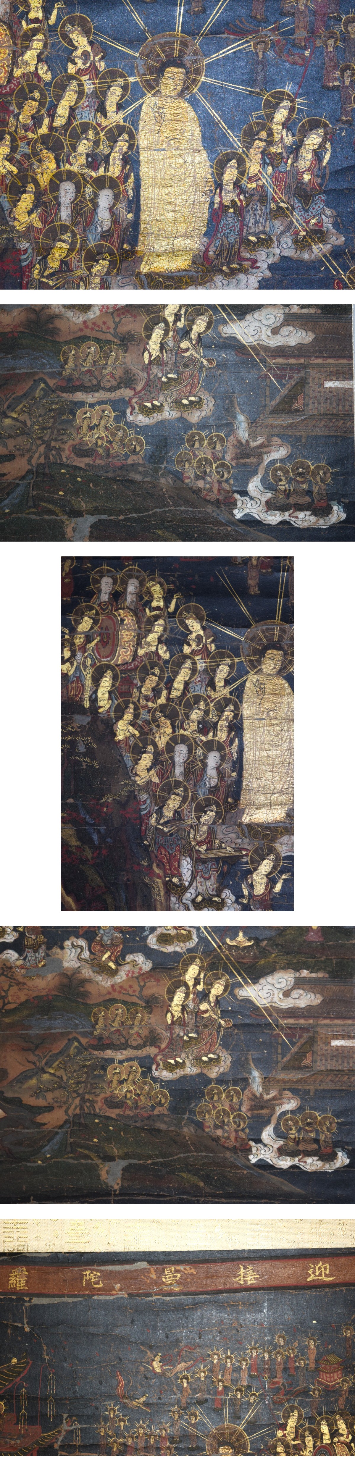 極楽楼閣の金線格子部分、波や屋根、またすべての衆生・阿弥陀の光背ならびに光線部分はみな金泥ではなく截金(キリガネ)です。