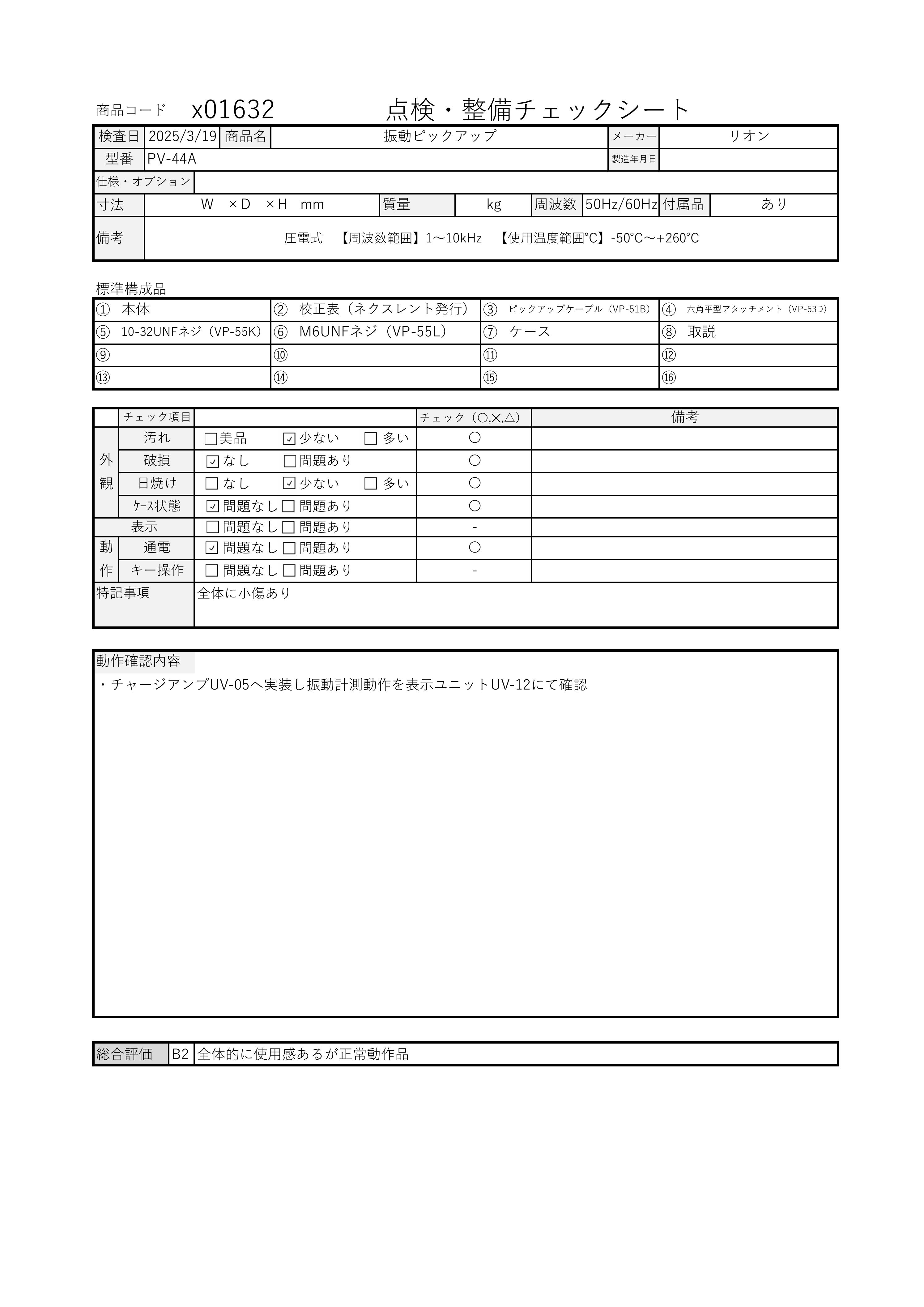 【中古】振動ピックアップ PV44A リオン RION 圧電式【周波数範囲】1~10kHz x01632 ★送料無料★[騒音測定器/振動測定器/粉塵測定器] 收藏